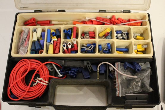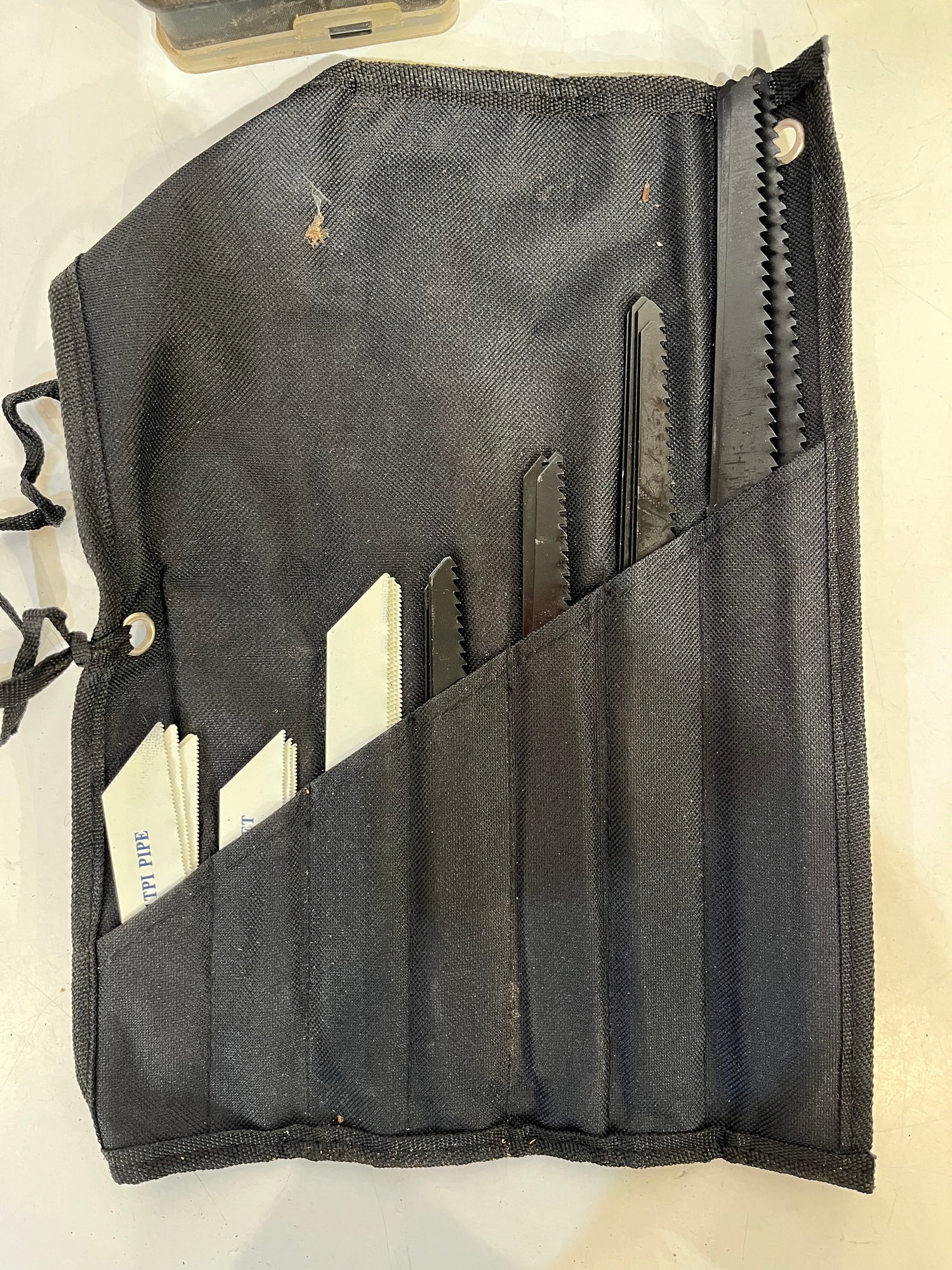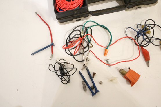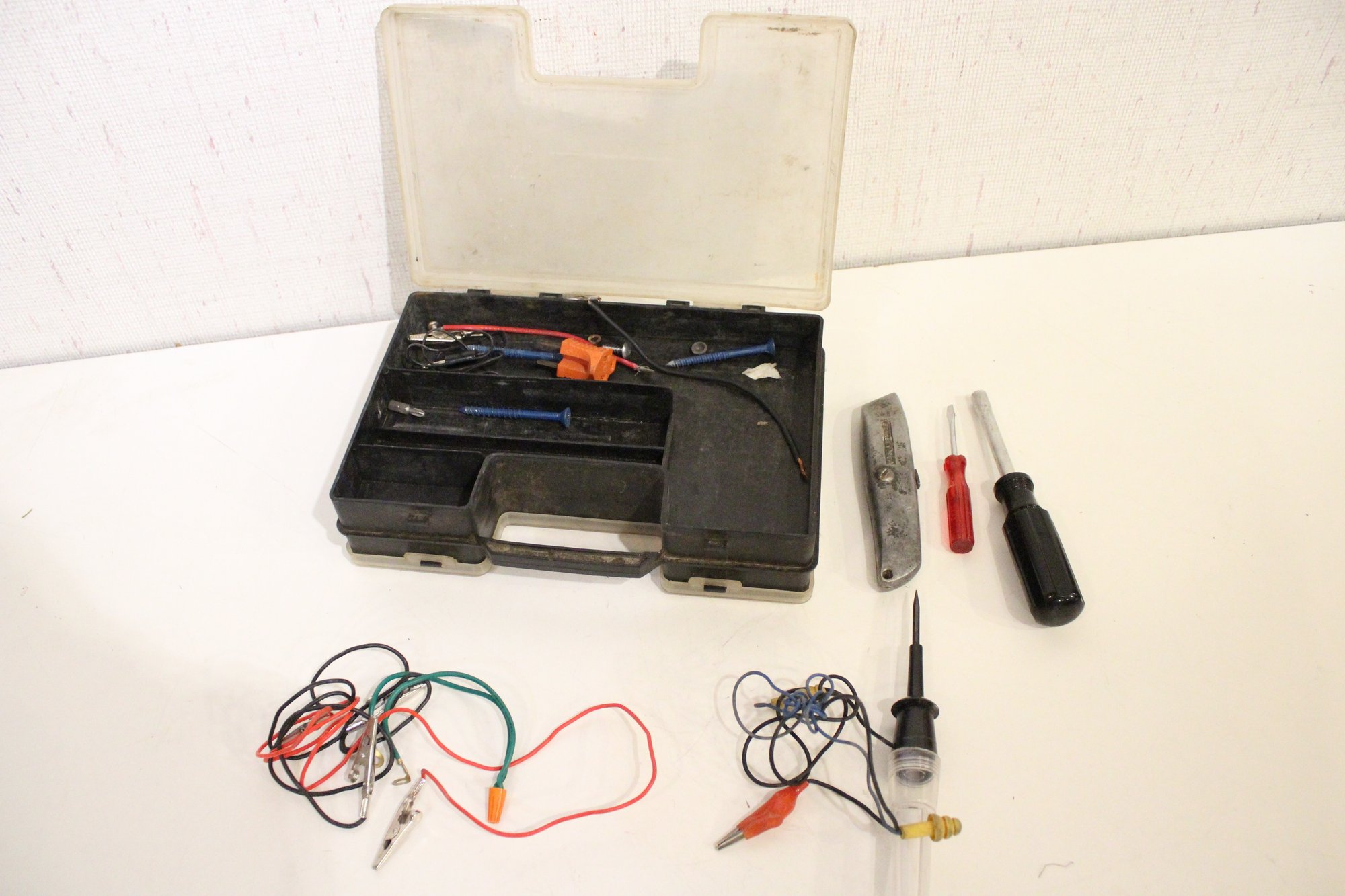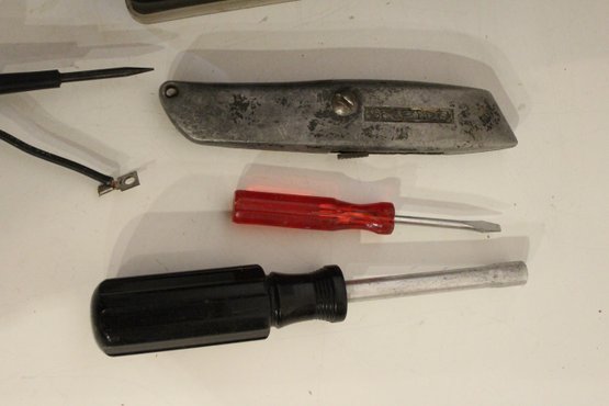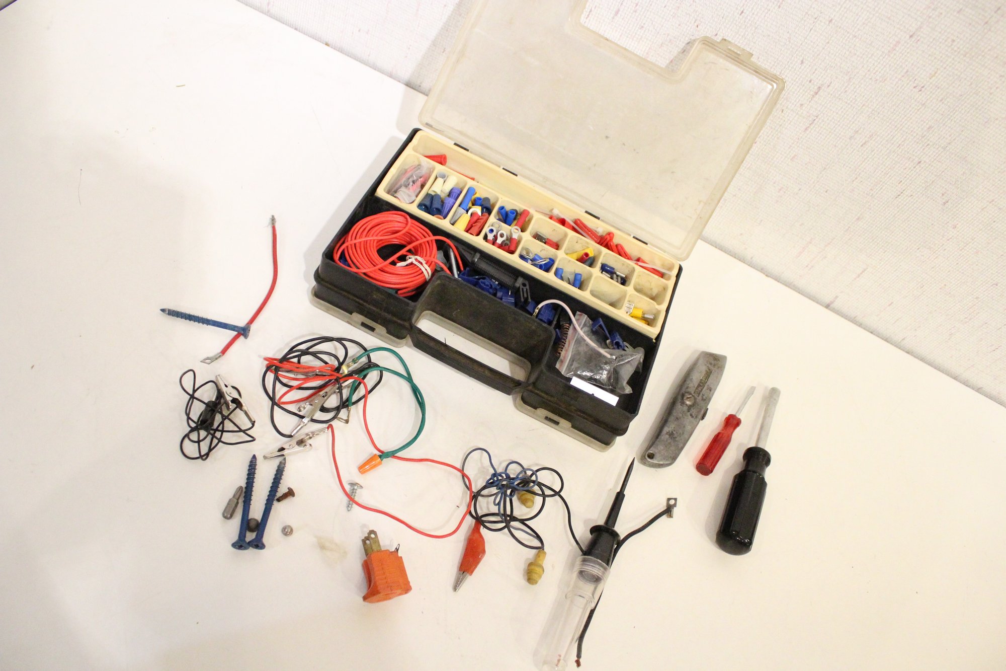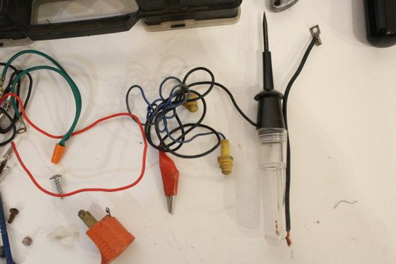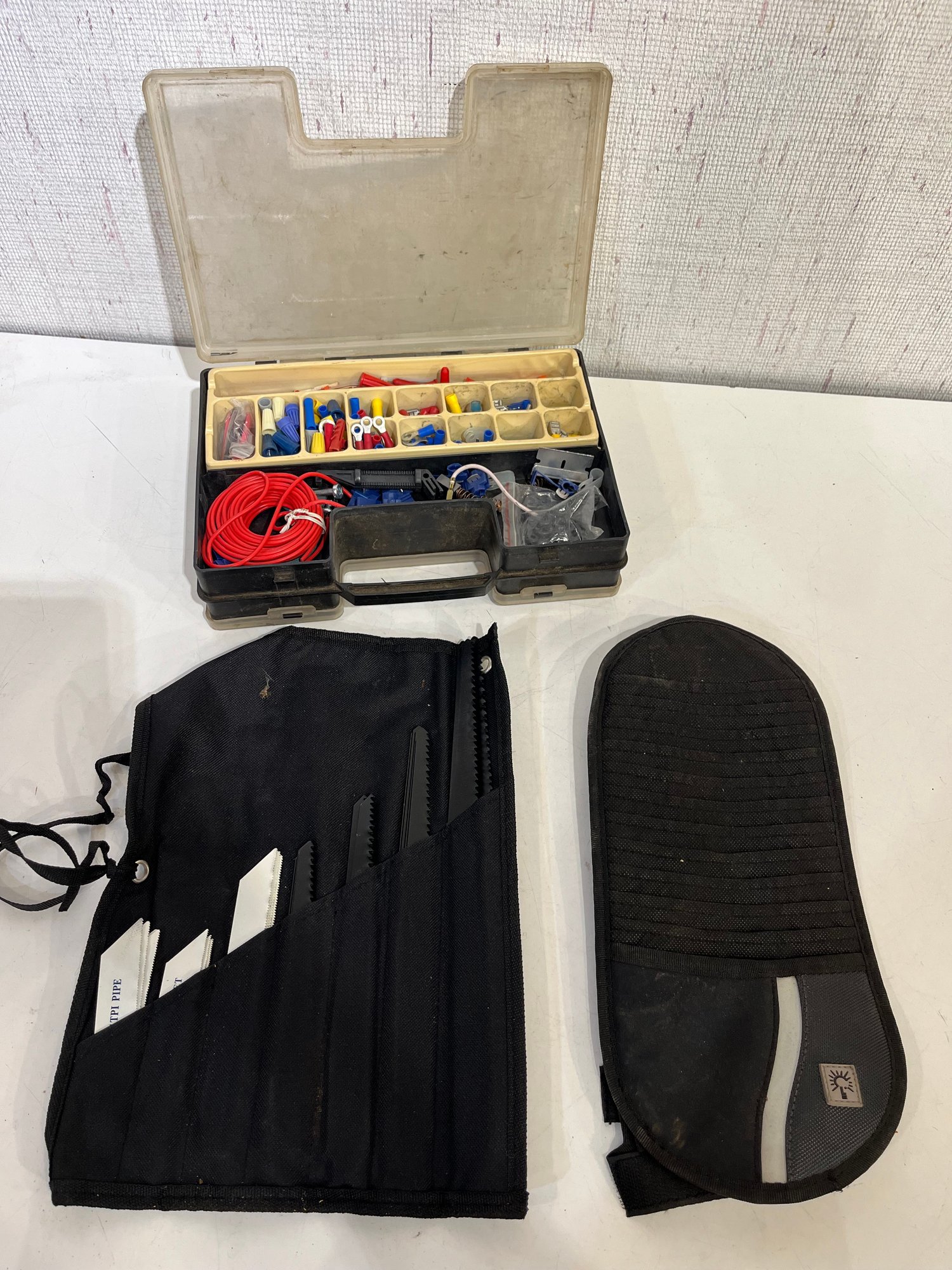 An automotive electrical repair kit with various tools as pictured along with a set of various sized saws in a roll-up bundle and a sun visor organizer. These items can be shipped.