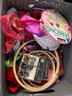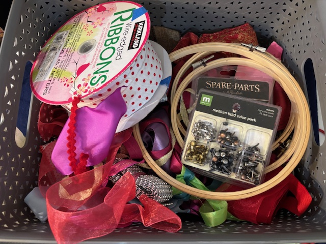 Lot consists of multiple ribbon scraps, 3 small embroidery hoops small, and large wheel of red and white heart ribbon, and two unopened packs of fabric tacks.