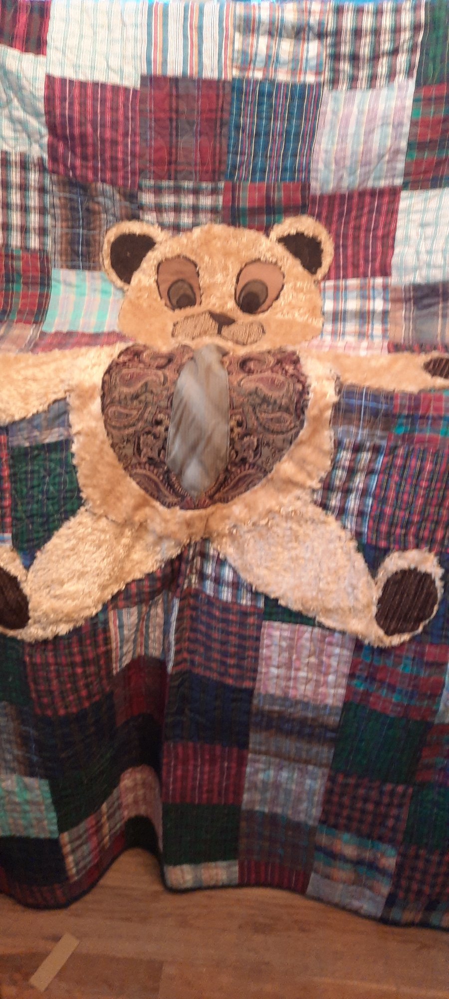 This handmade quilt is one of the cutest I have ever seen. It has a hand-stitched bear with a tie in the middle. The quilt is made of patch work with greens, blues, tans and a variety of other colors.
