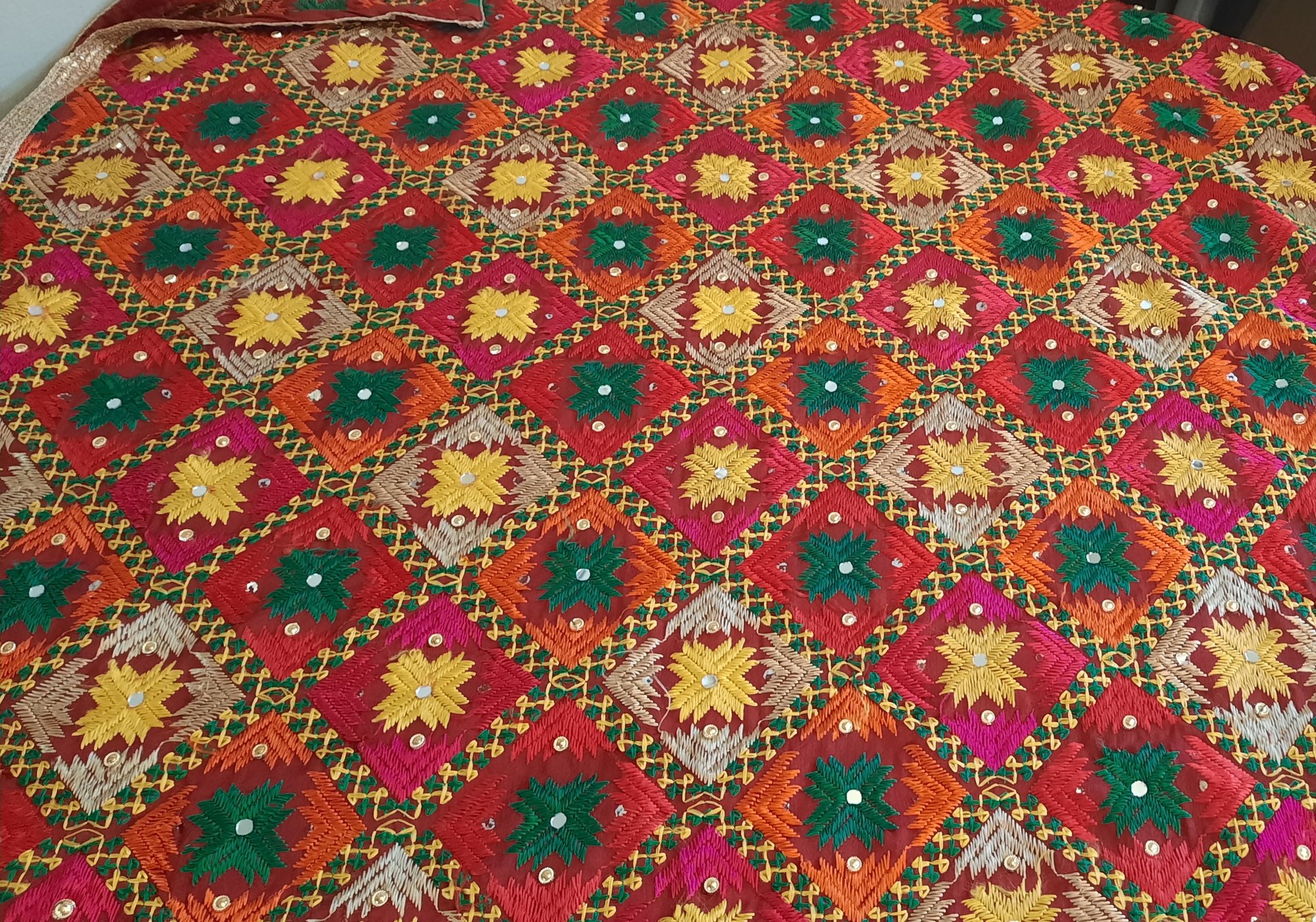 A traditional embroidery Punjab. The entire cloth is embroidered with bright flowers and gems. A 1" gold trim surrounds this beautiful piece.