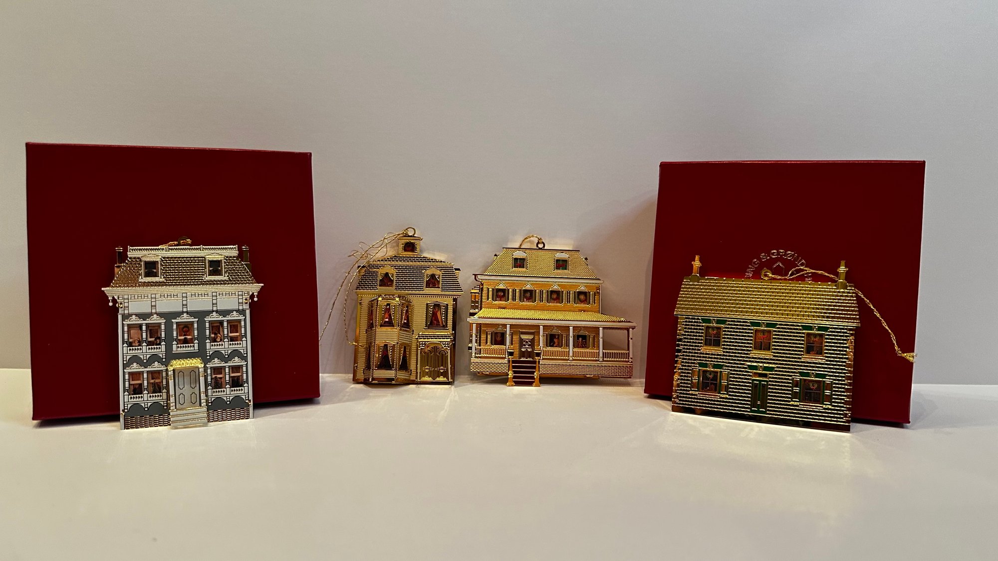 Gold-tone brass with intricate enamel detailing, capturing the charm of historic buildings
