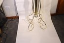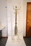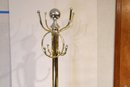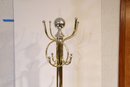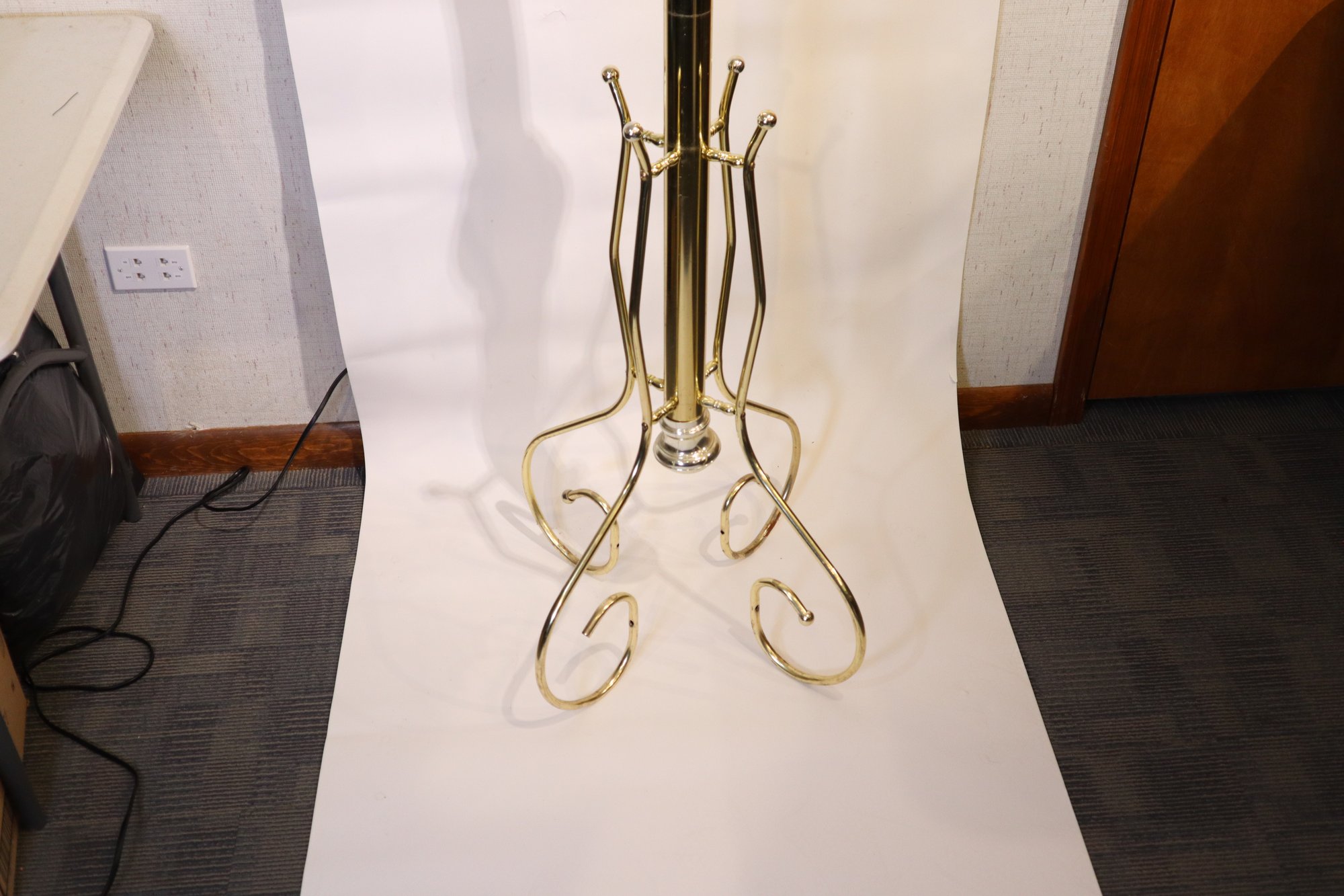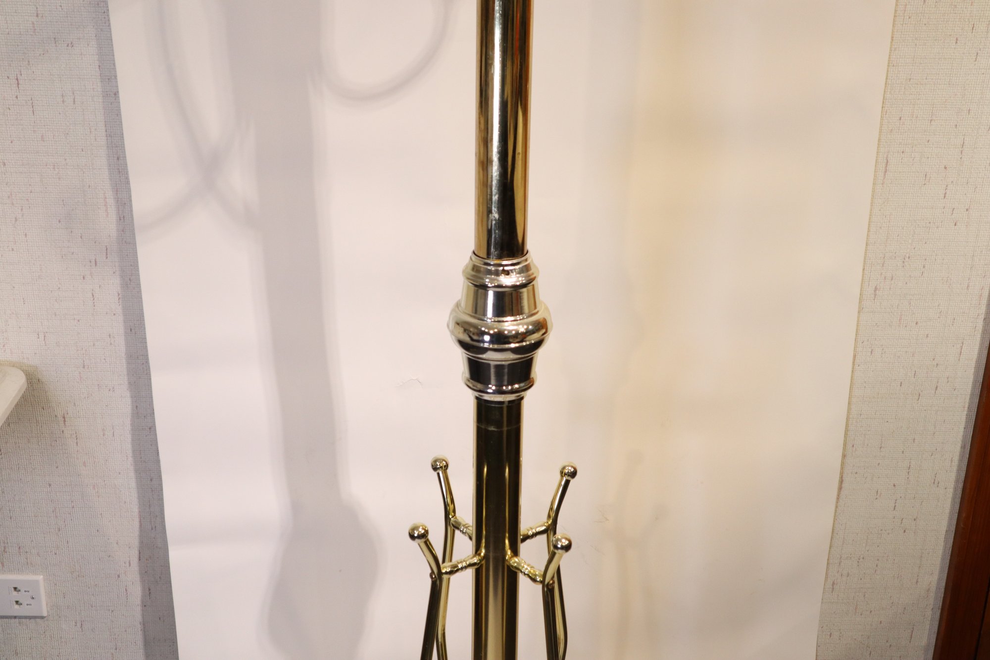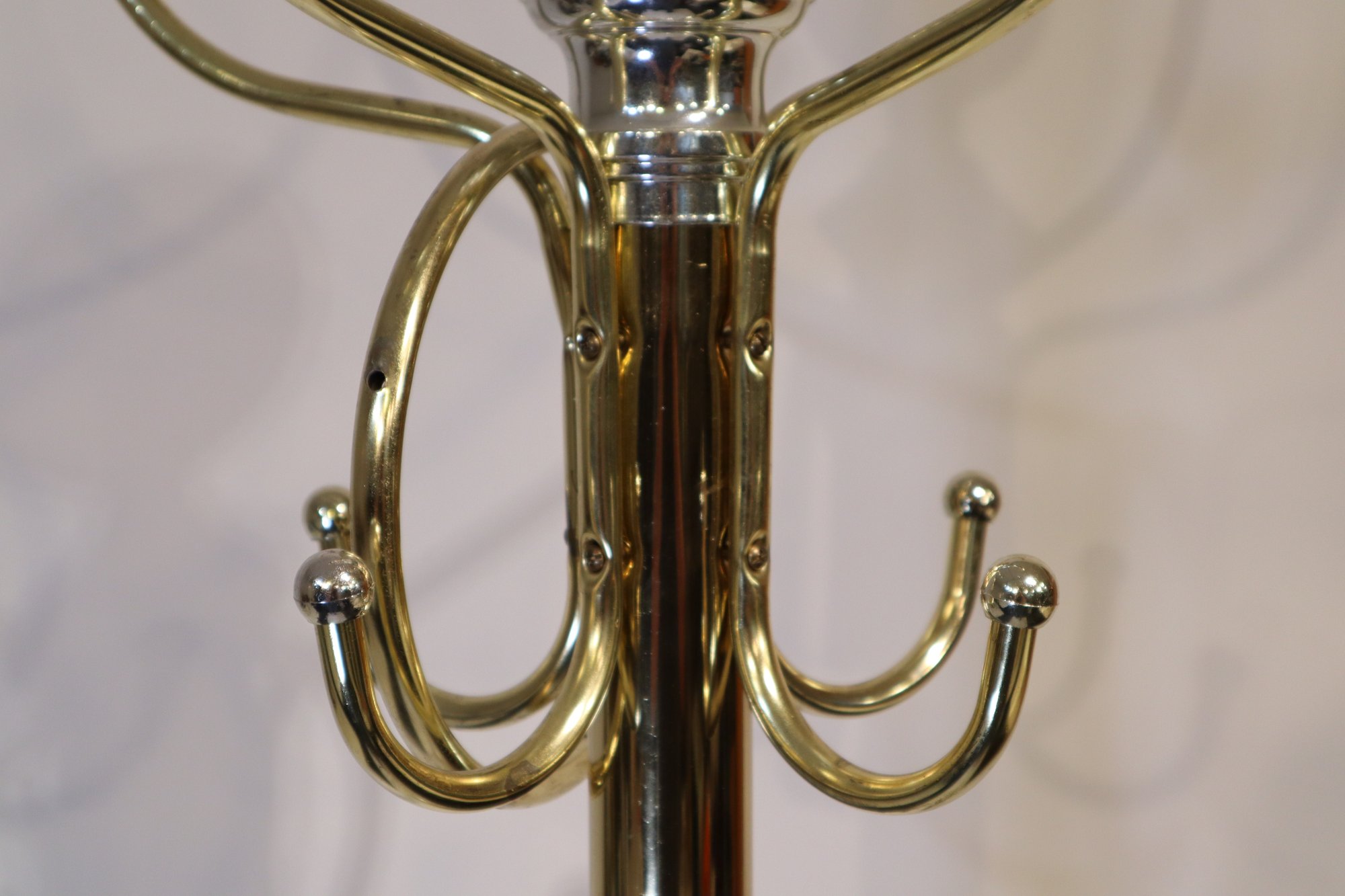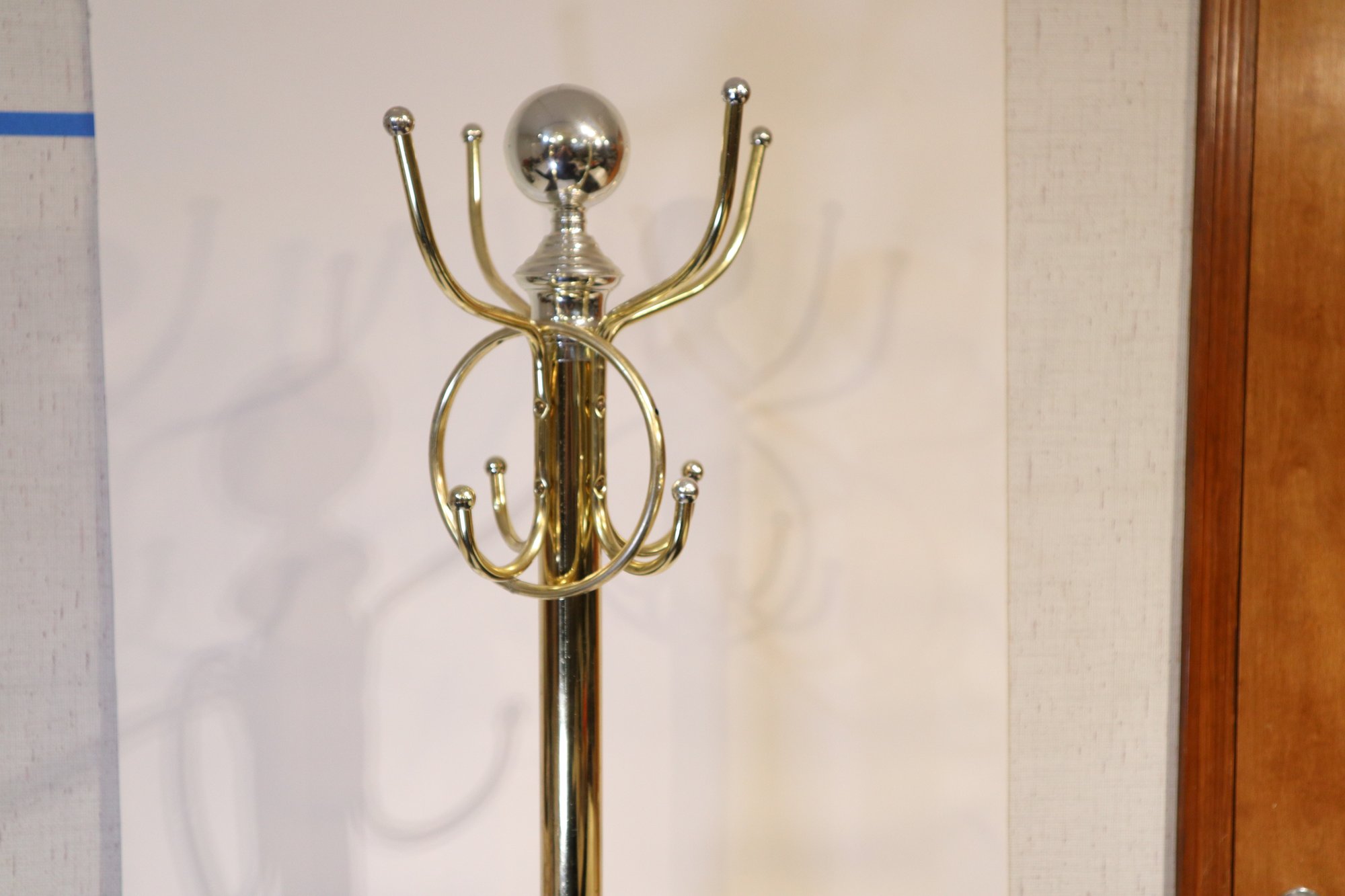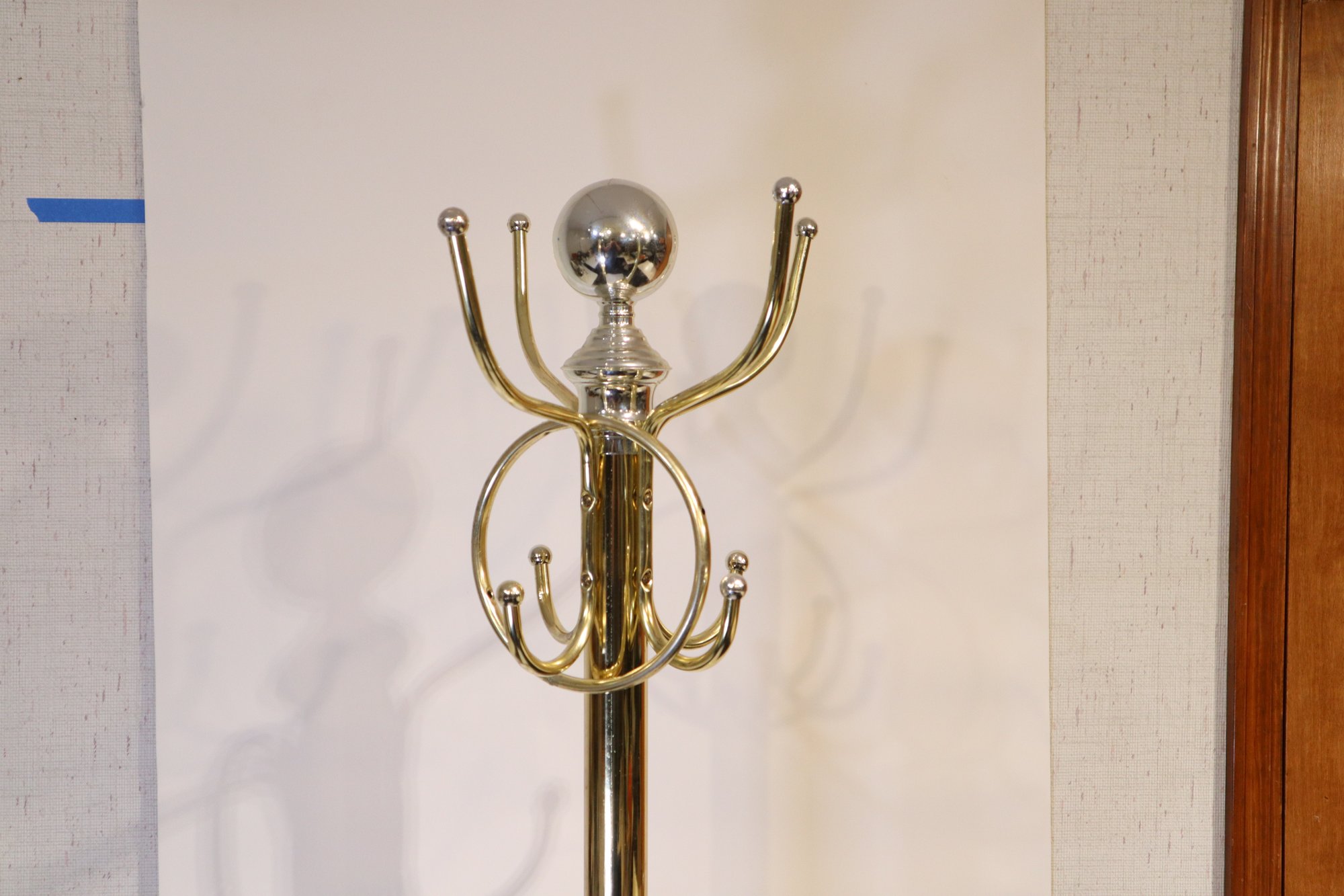 An art-deco style brass and chrome hat tree. The brass parts are metal, and the chrome parts are plastic. The bottom reinforcement ring is detached but is part of the lot. The center decorative element is loose and slightly damaged at the connection point. The top finial is loose but undamaged. The legs are loose, but only due to the reinforcing ring being detached. Not eligible for shipping.
