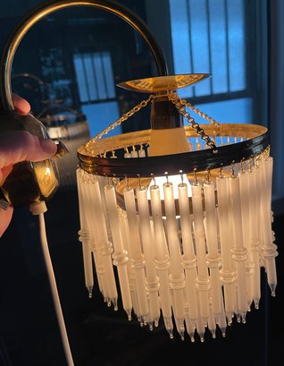 A pair of salvaged wall-mount sconces with 2 levels of brass rings with frosted glass crystals. A few crystals are missing or broken on each one.