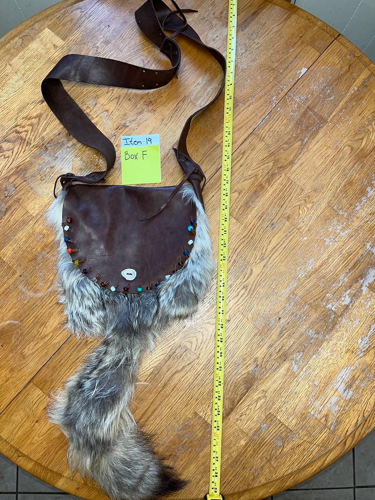 Brown leather purse with animal fur and attached tail. Multi colored beads on purse with wood button.