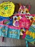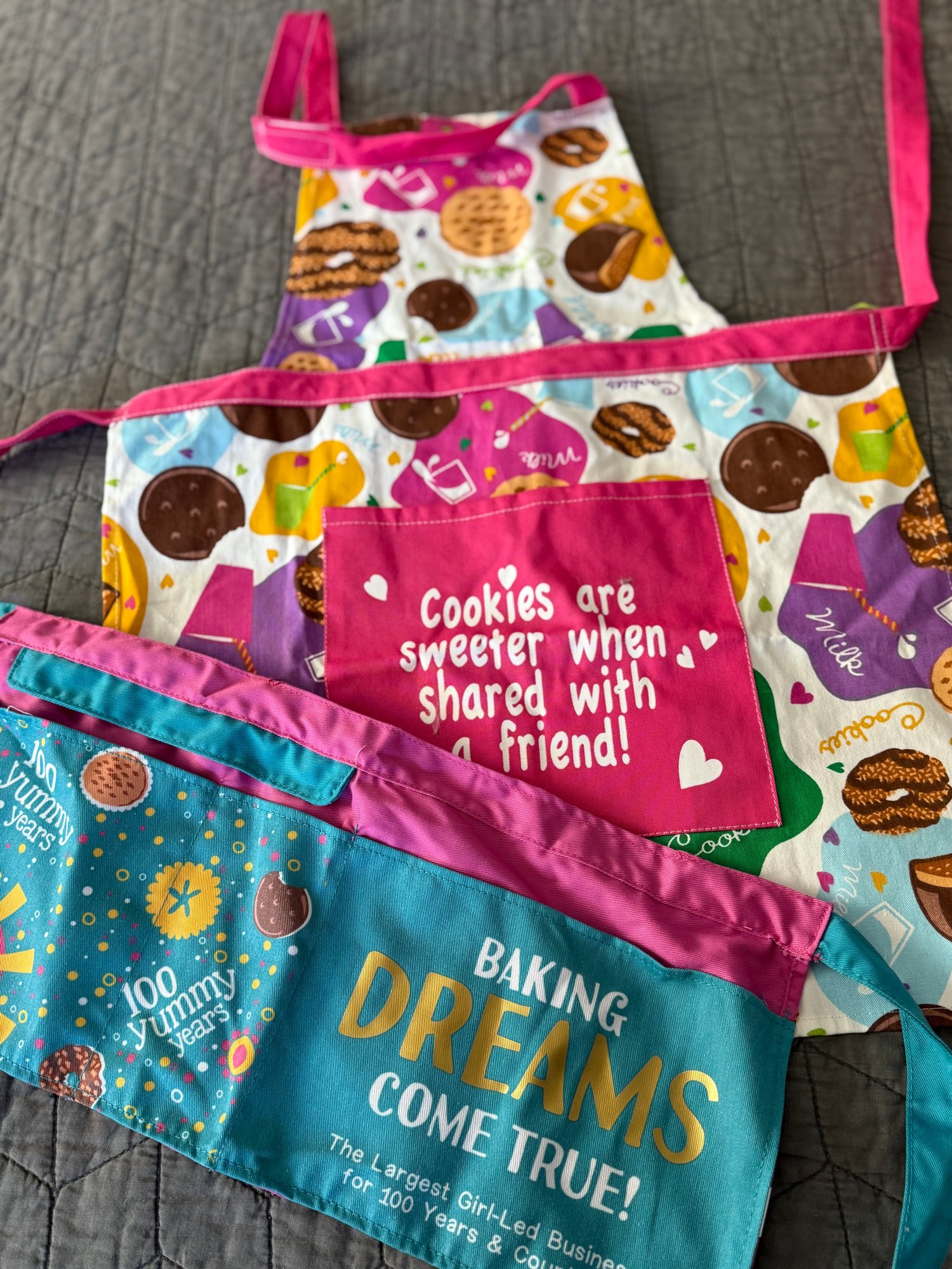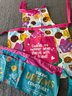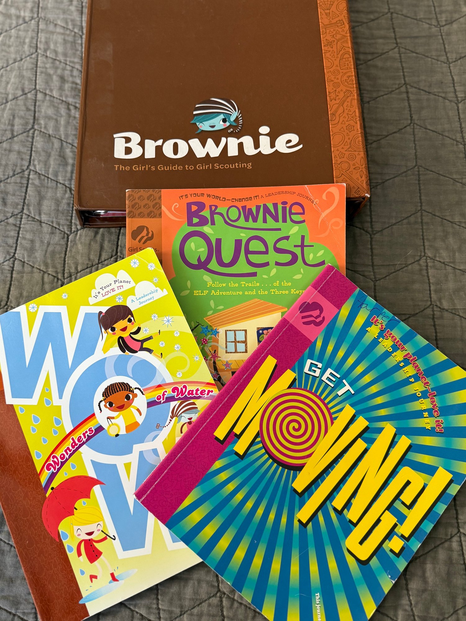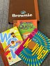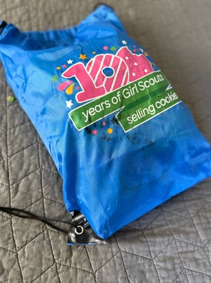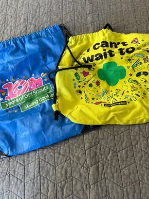 Brownie and Girl Scout memorabilia, including a brownie handbook and three activity books, two aprons - one serves as a cash bag for cookie sales and two string backpacks. All memorabilia fits into one 16“ x 12“ bag. Activity books are unused and in great condition.