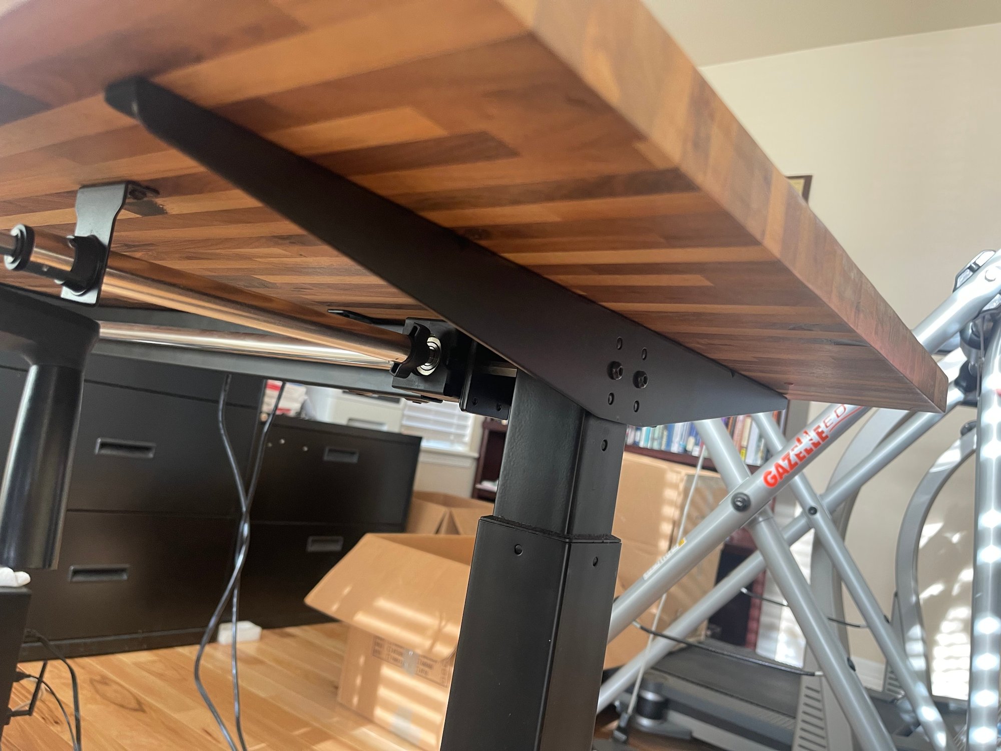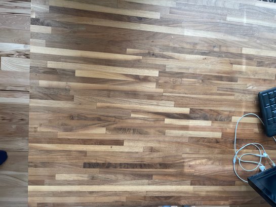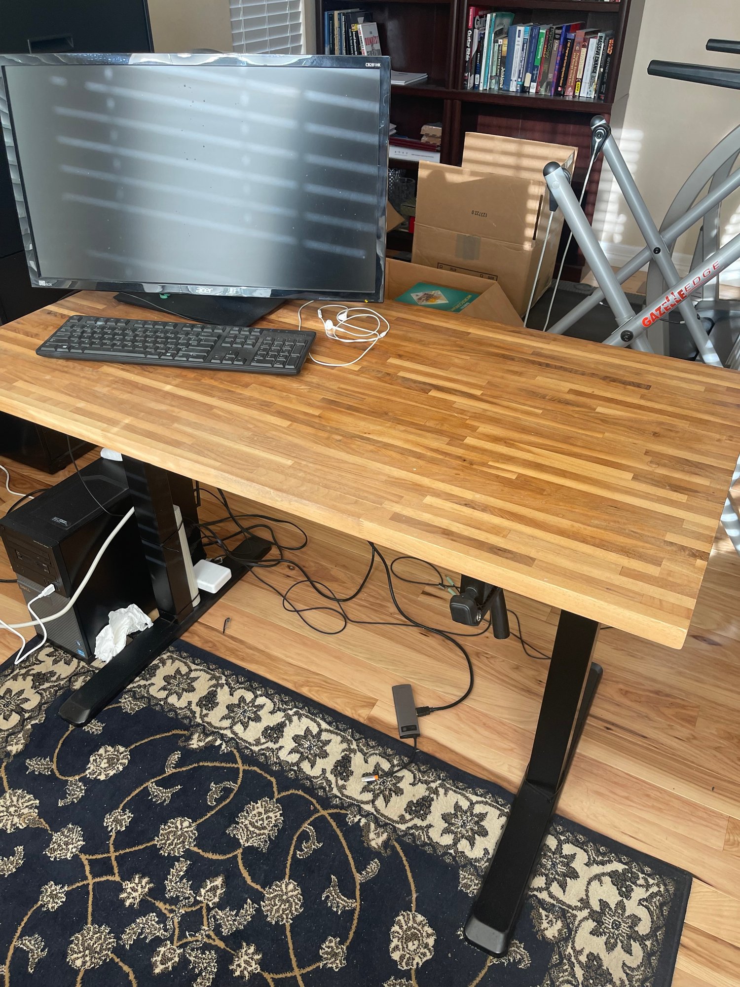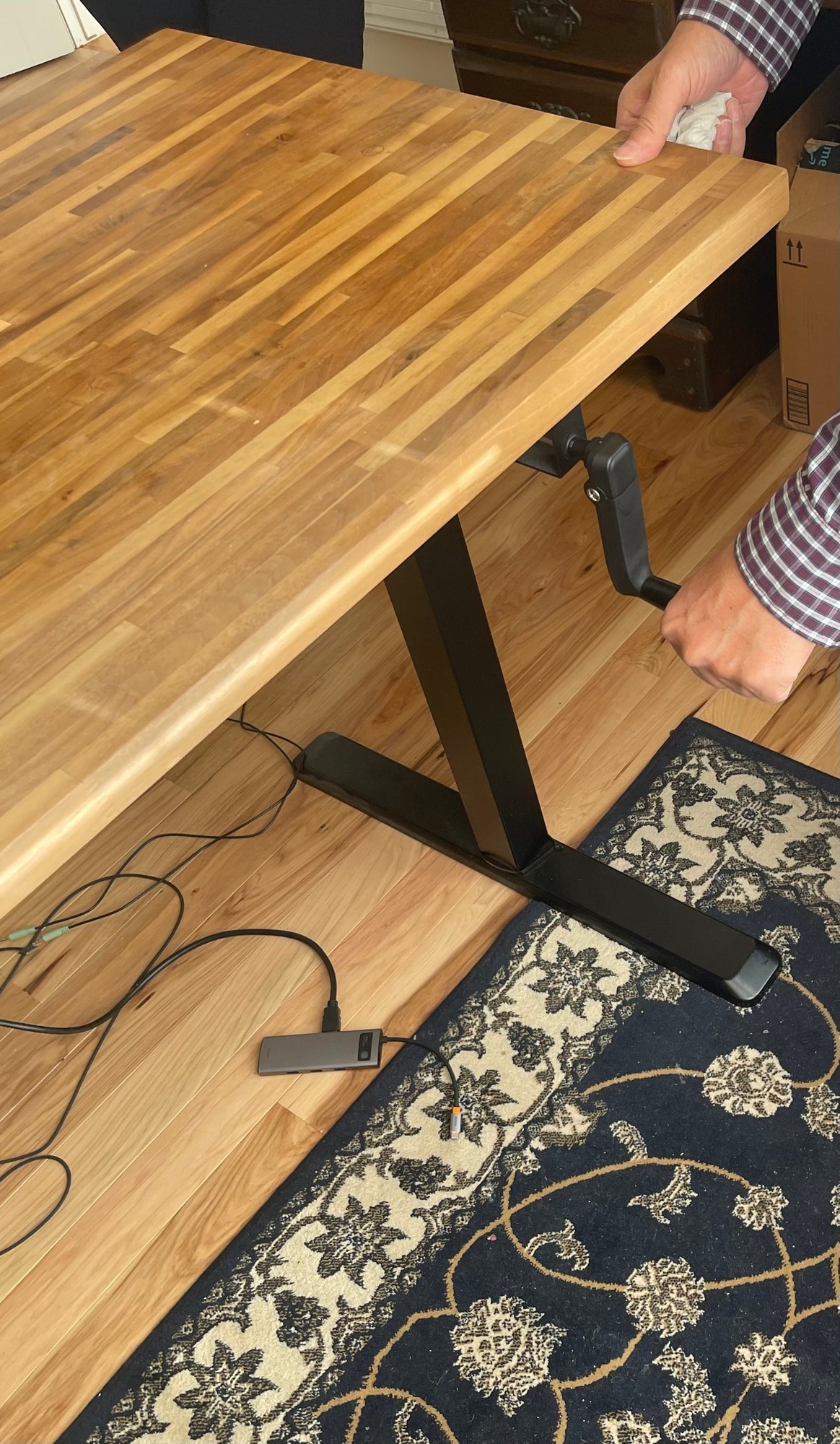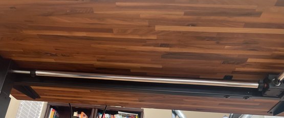 solid butcher block top, metal base. 48.5 wide, 25 deep with adjustable height , via crank - see photo