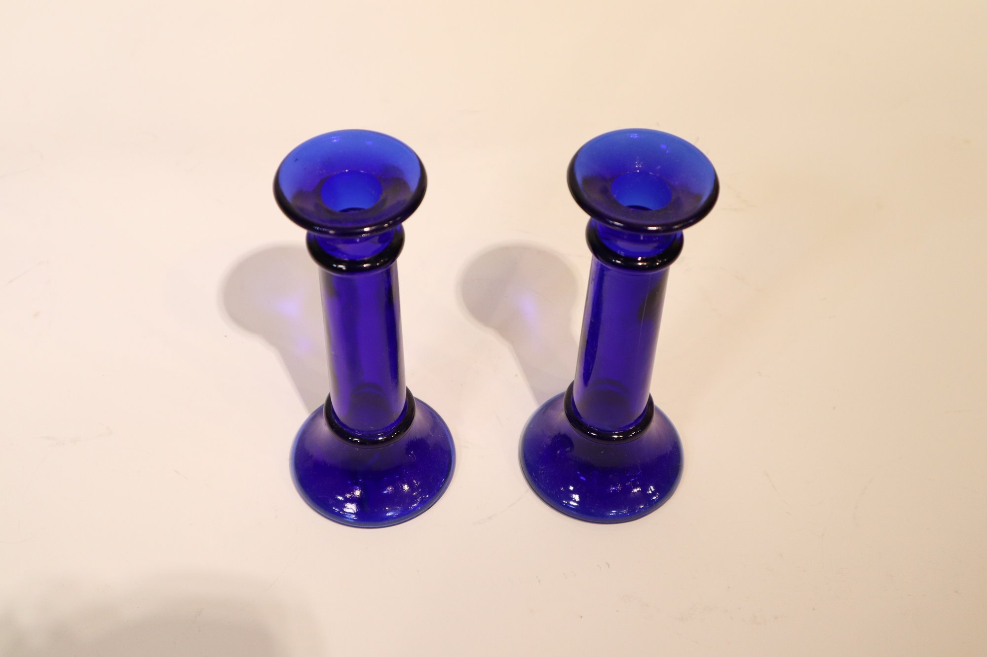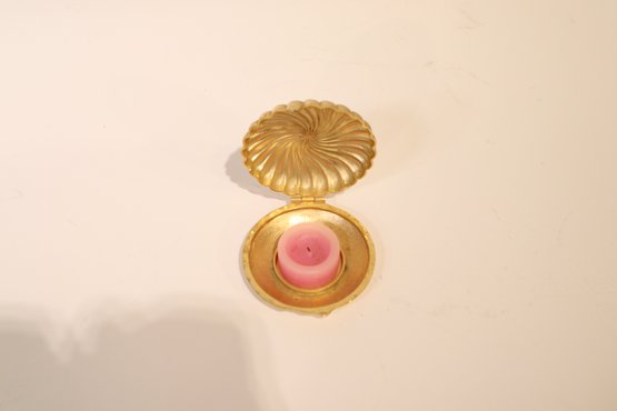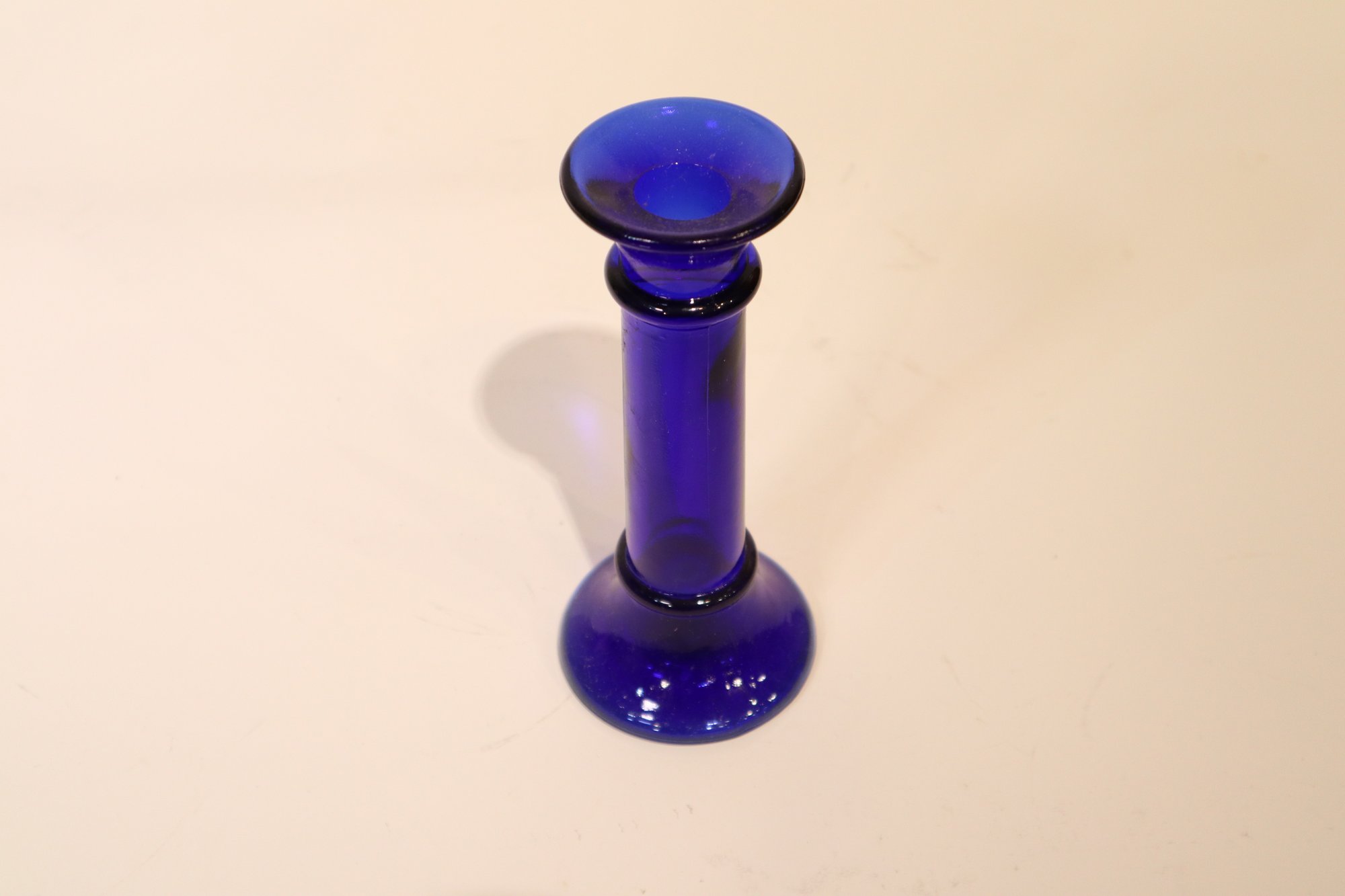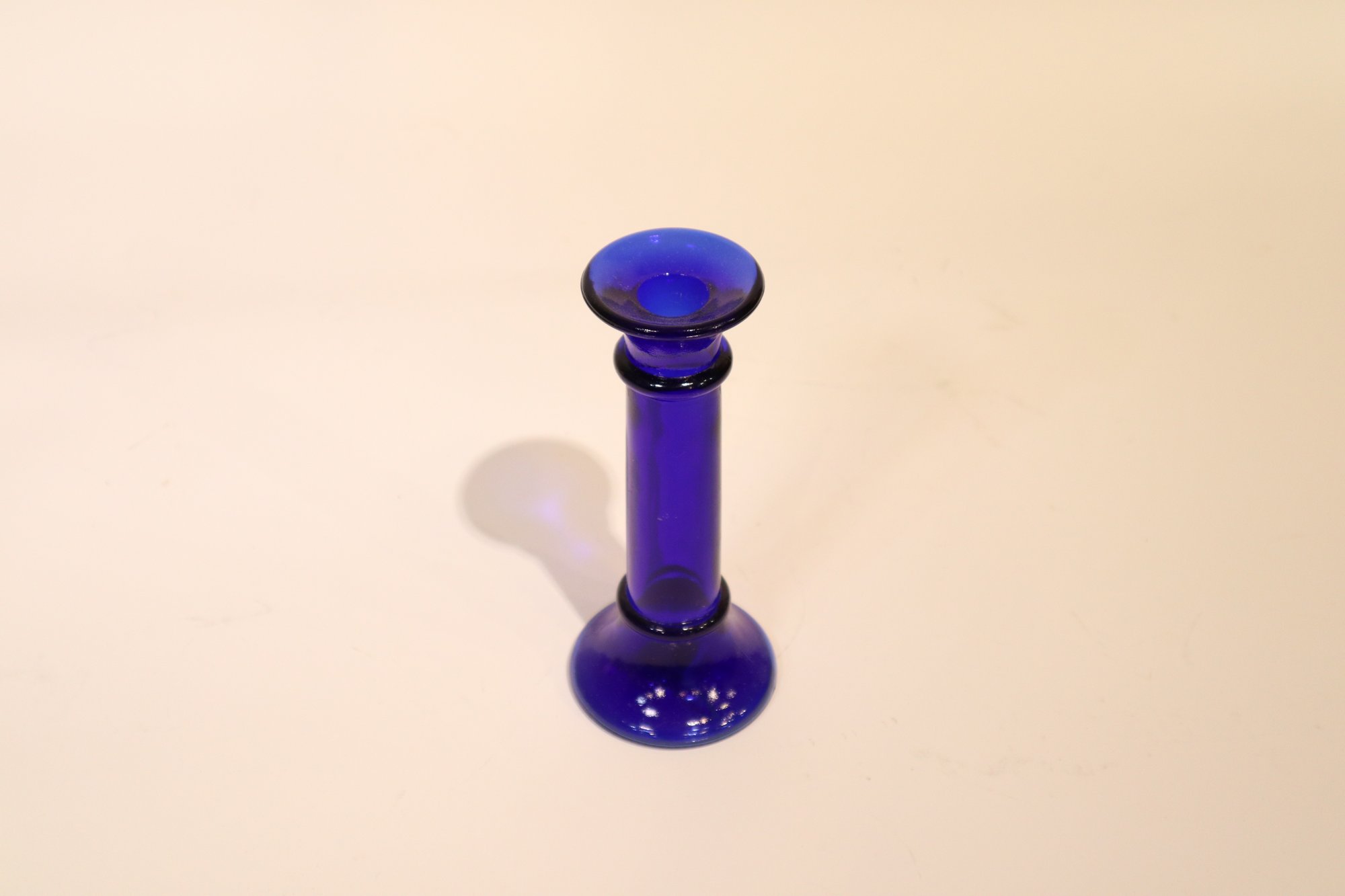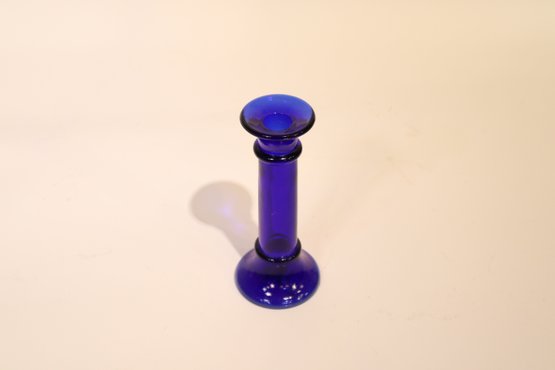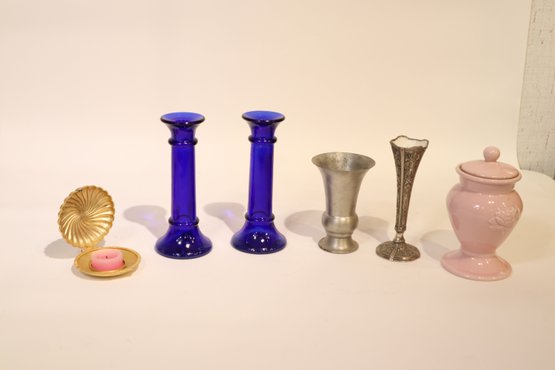 A collection of candlesticks, vases and candles. Two blue glass candlesticks, a pink pot candlestick with a pink candle and a golden clam-shell with a small tea candle inside. This lot also includes two interesting vases, a pewter vase produced by the Royal Holland Pewter company, and a silver plated stem vase produced by Raimond Japan in the 1950's or 60's.