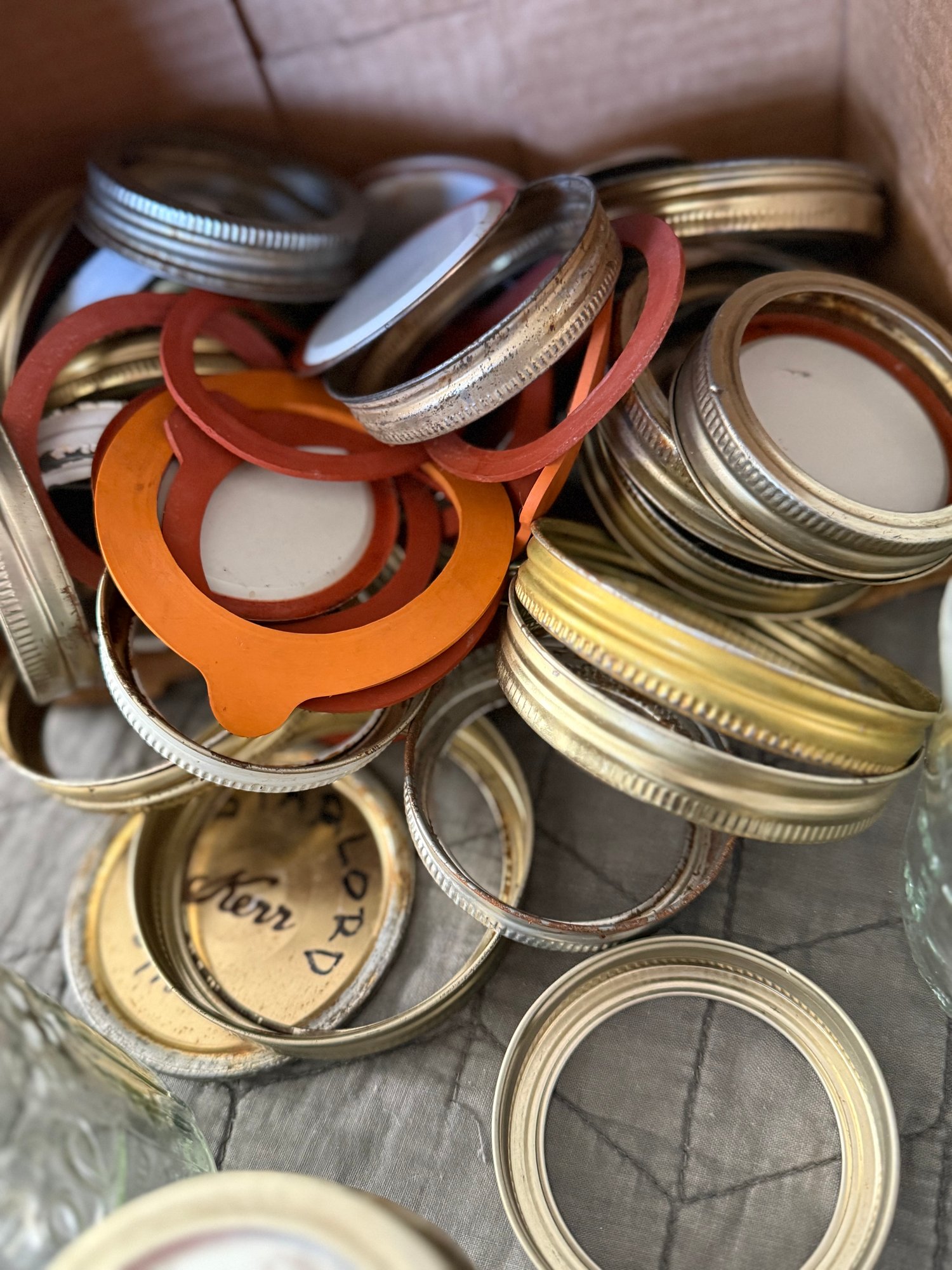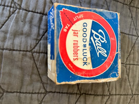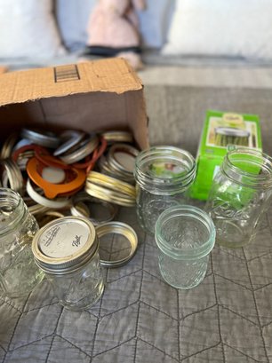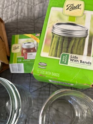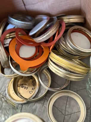 Assortment of canning supplies, including five jars, a box of unopened lids and bands, small box of lids and various loose bands. Vintage empty box for Ball jar rubbers. Some items in brand new condition others are moderately used.