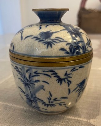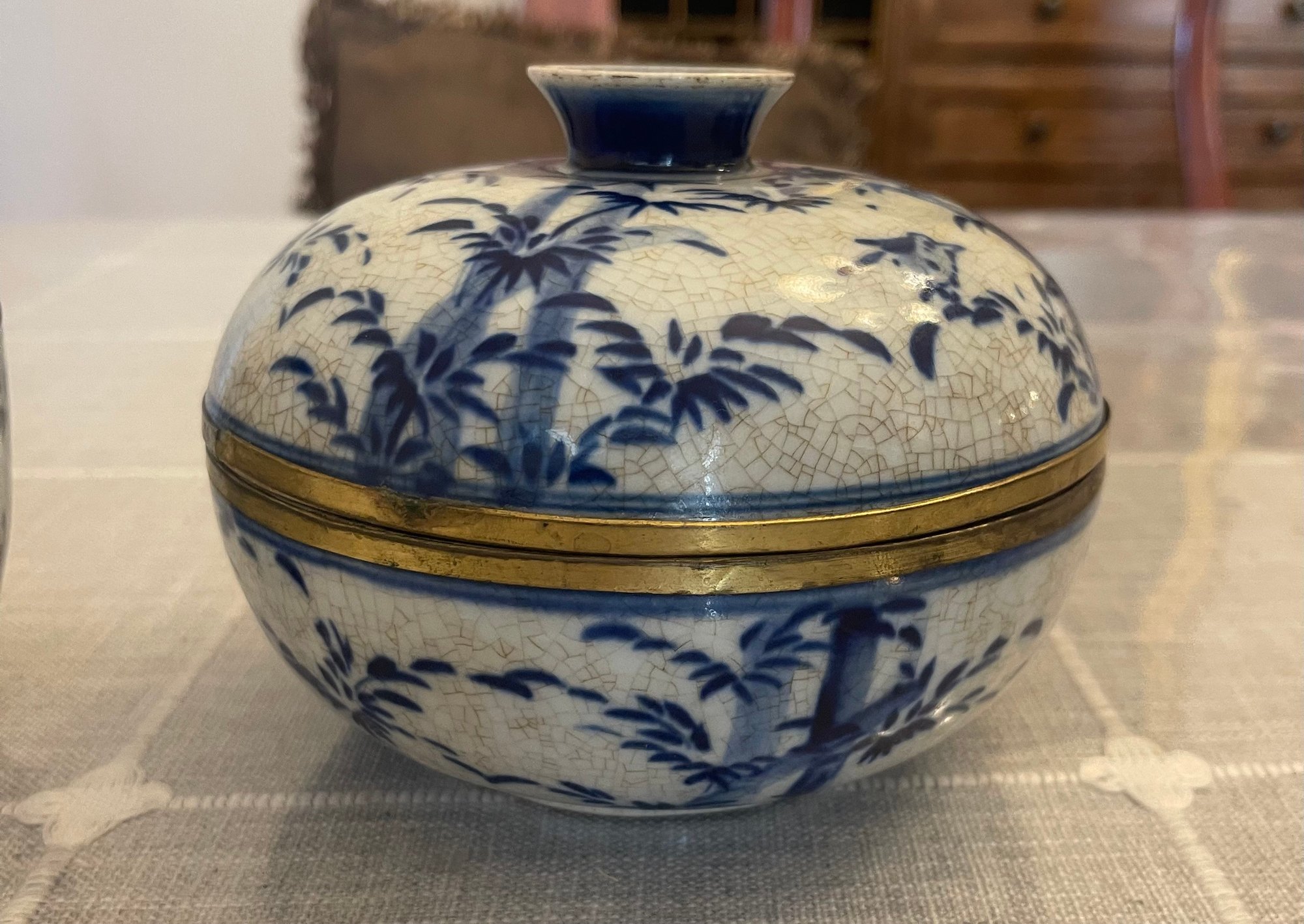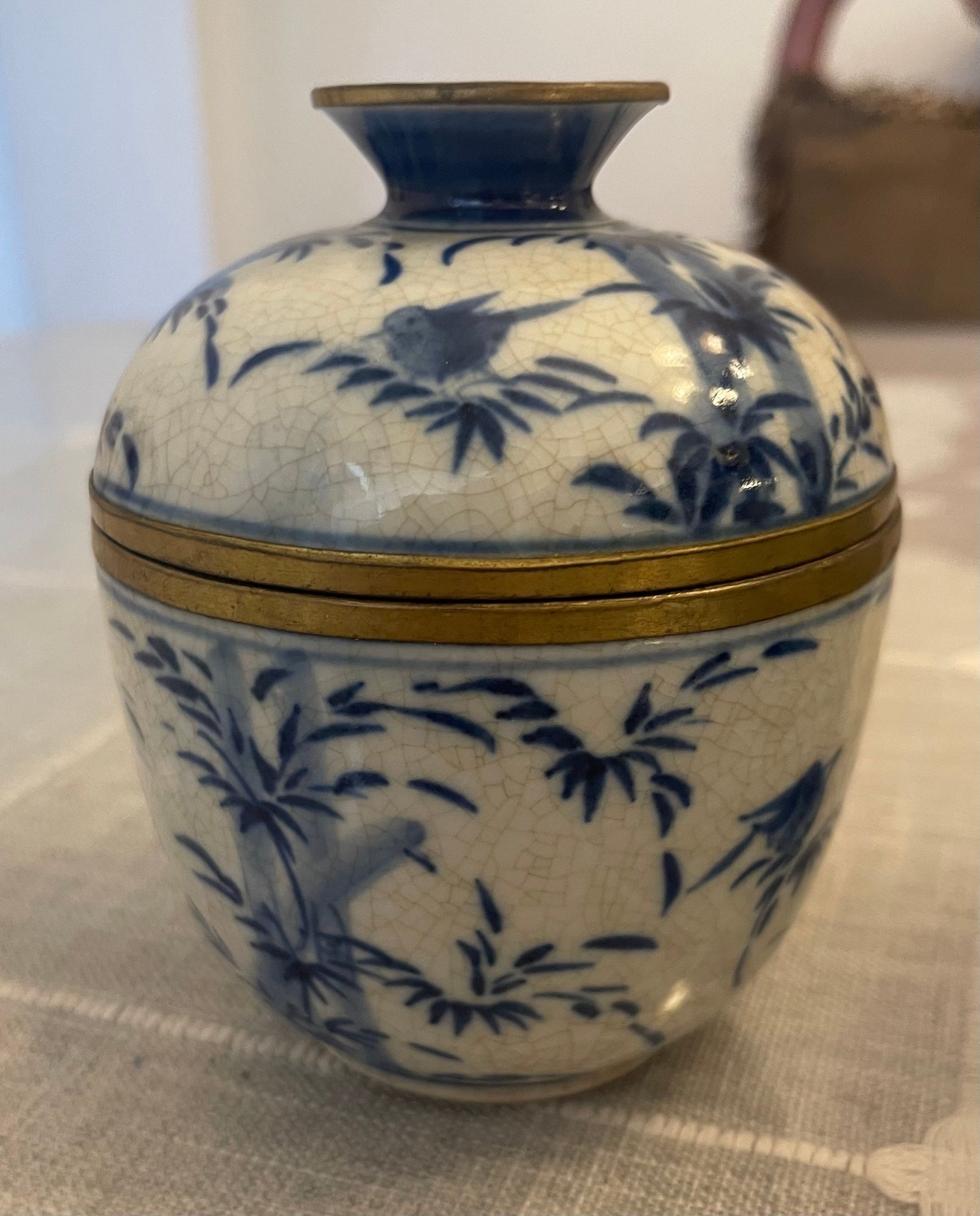 Structure: It includes a fitted lid and is framed with brass strapping on the edges, a common feature for Chinese porcelain intended for export markets.