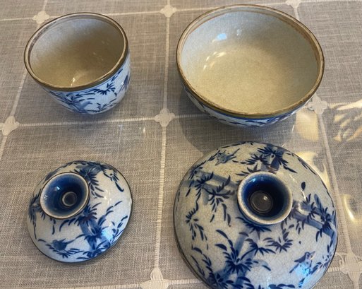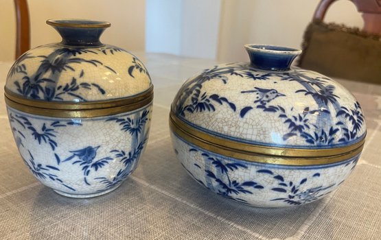 These appear to be 19th-century Chinese cracked porcelain covered pots, often referred to as lidded jars or urns.