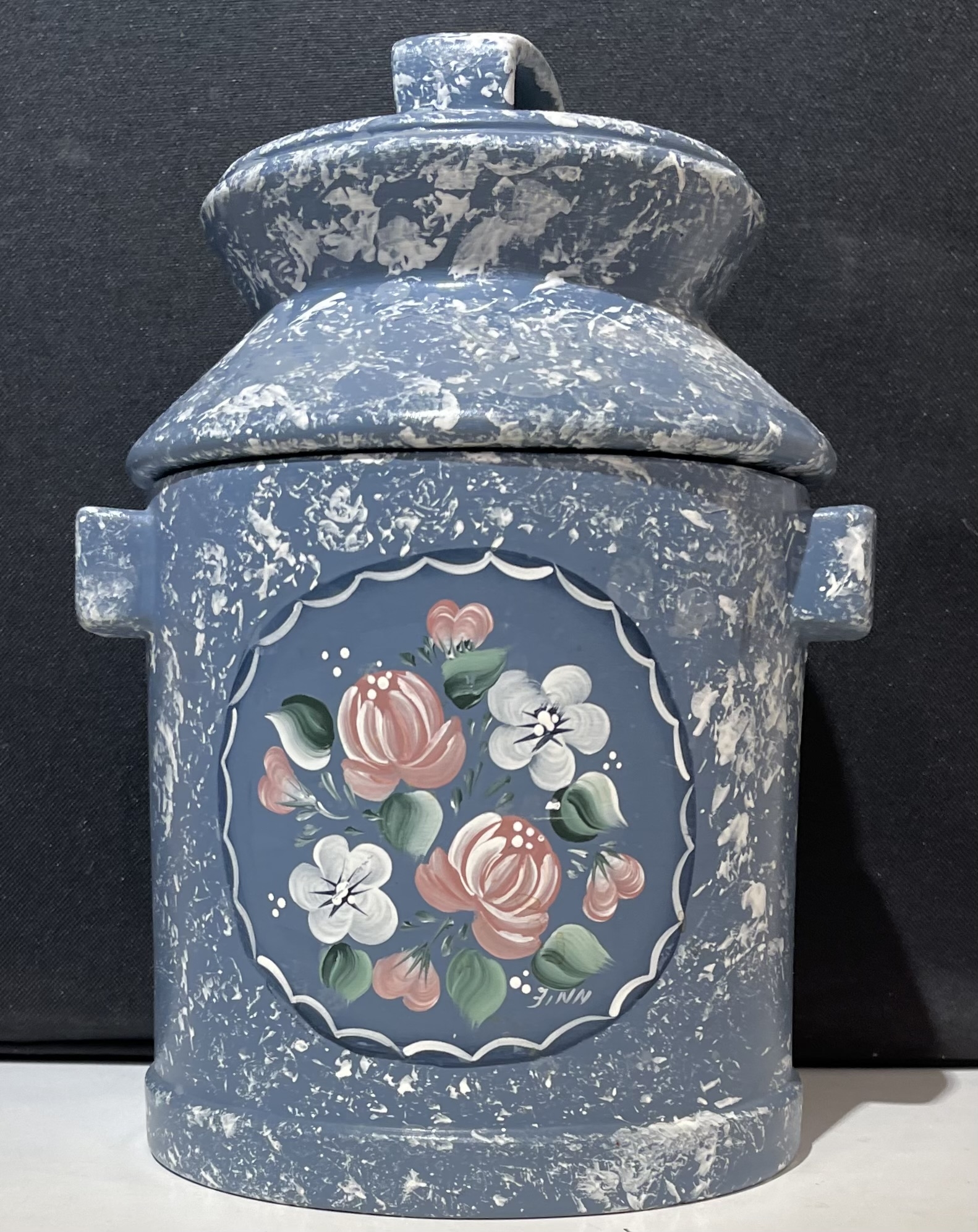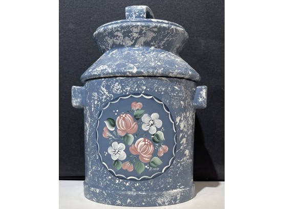 10.5 inches high, 6 inch diameter ceramic cookie jar in shape of a milk cannister, beautifully decorated with a floral pattern on the front