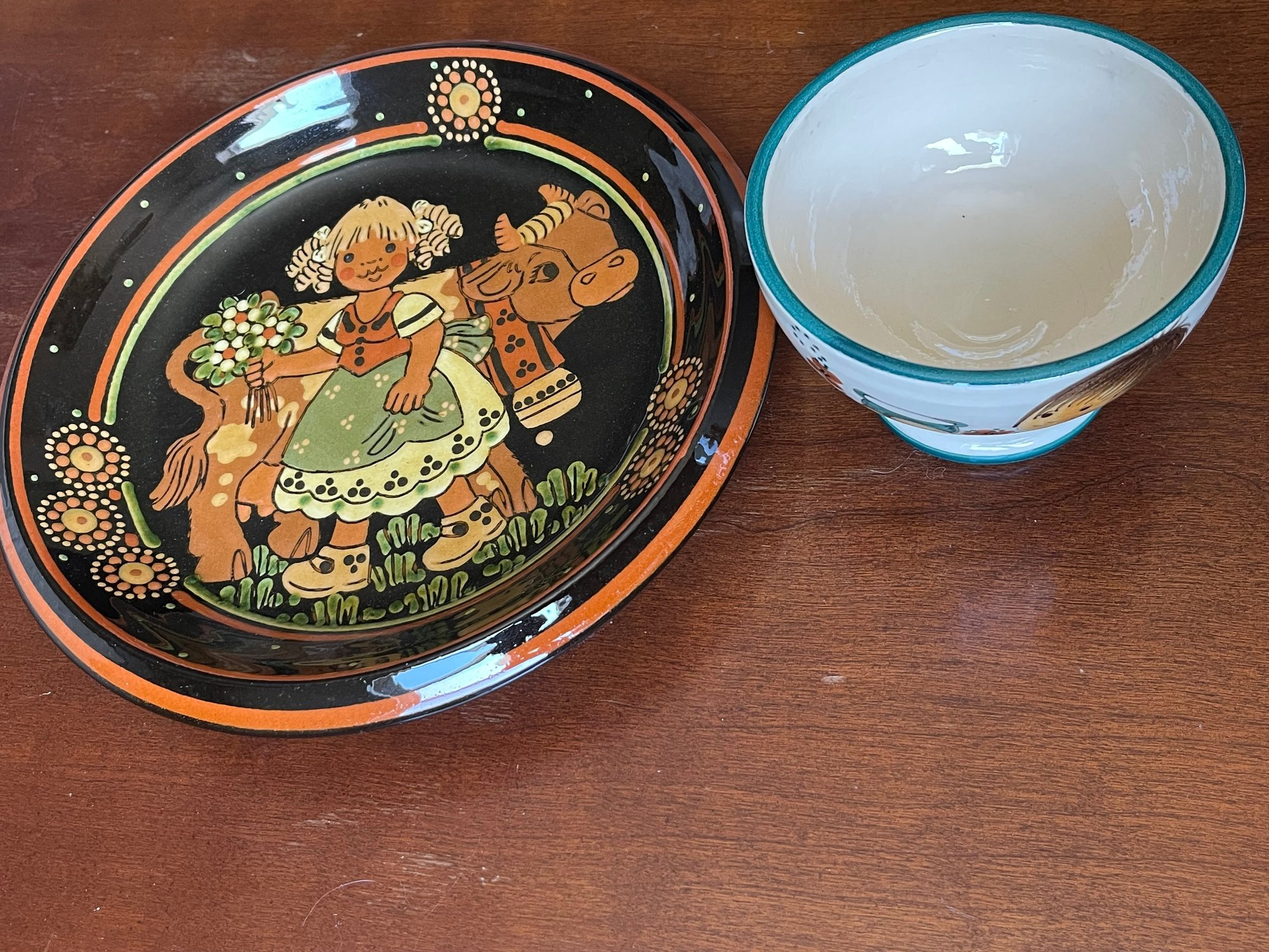 Very heavy ceramic plate depicting a little girl like Heidi from the Swiss folktale, and a bowl depicting Heidi and Goatherd Peter