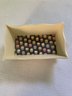Wooden box/tray painted with creamy off-white, chalk paint. Elevated on little round legs. Cupcake wallpaper liner that can be easily removed 12” x 7” in good condition. No splits or cracks in the wood.
