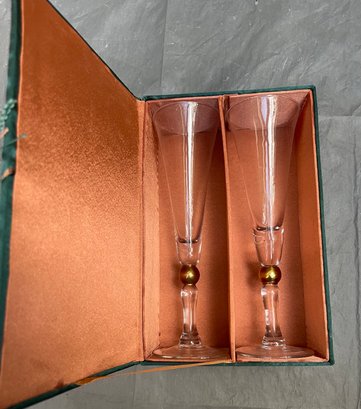 9 inch champagne flutes, stamped with the year 2000, in a satin lined box