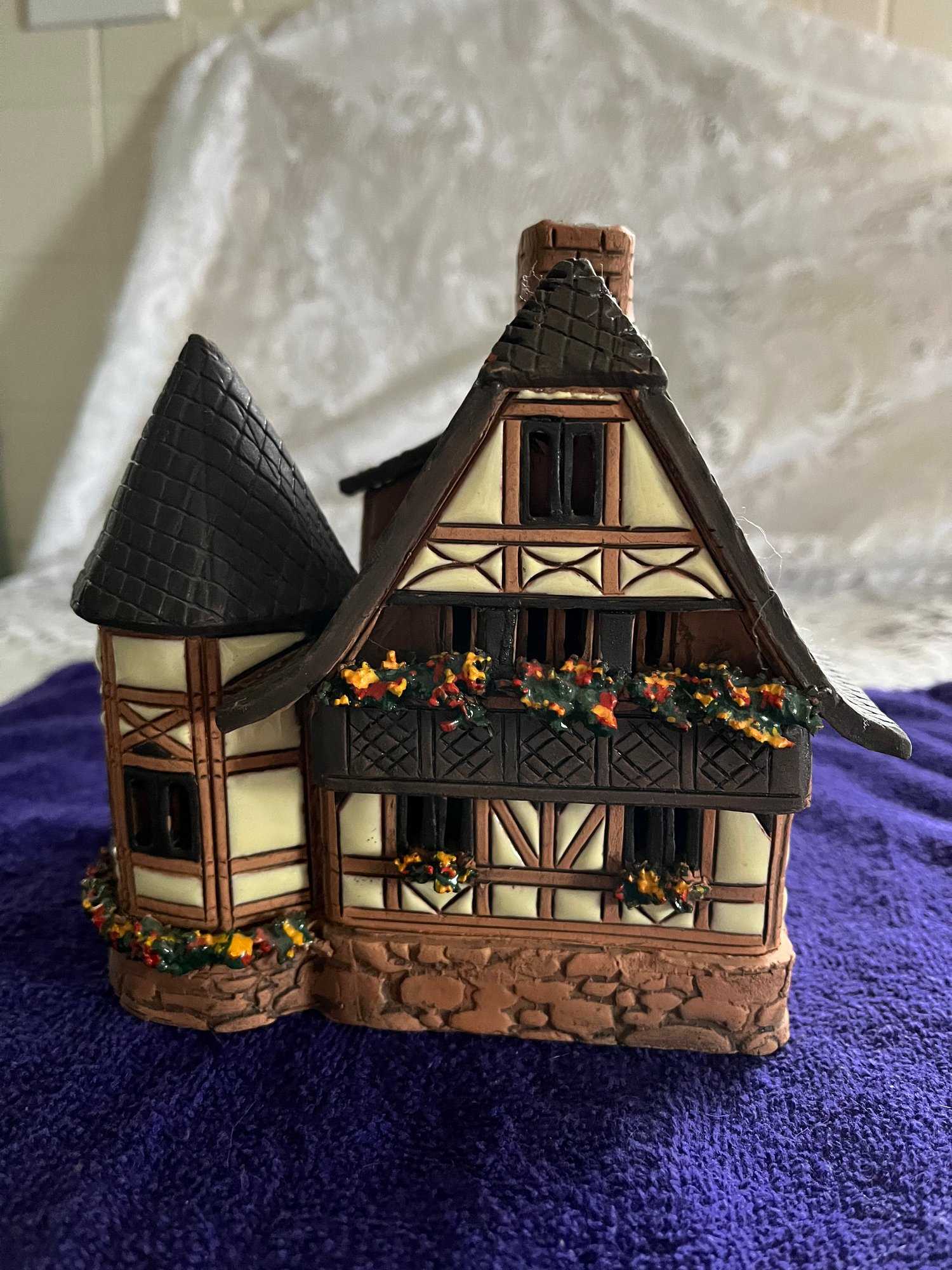 Clay Cottage with tile siding and painted flowers. Made in Lithuania. Comes with a votive to light up the cottage and scent oil, which allows for a drop or two of the scent into the chimney to add to its charm.