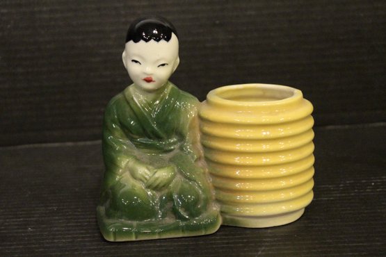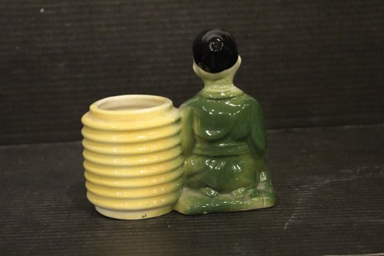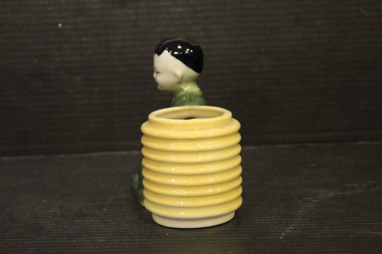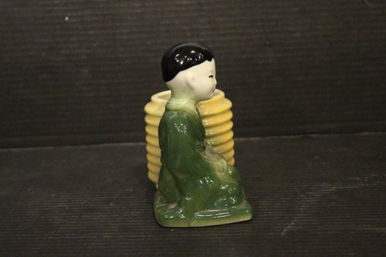 Vintage Oriental Planter Chinese Boy Man with Yellow Basket Ceramic 6"
