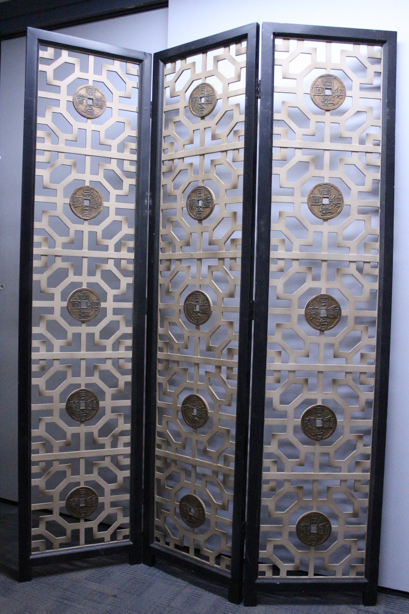 A Chinese decor room divider with intricate wood panels containing an oversized Chinese coin in every block in the panels, 69" x 49". This item is not eligible for shipping.