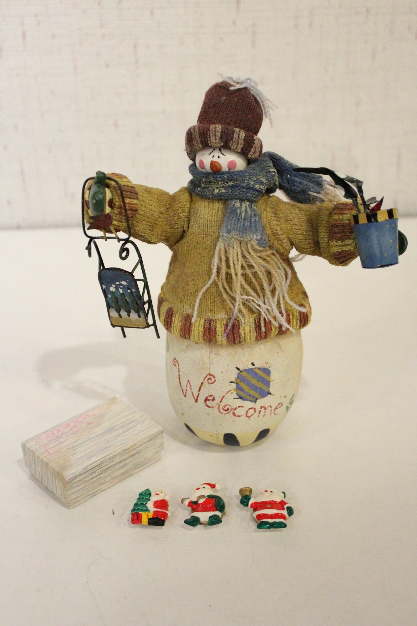 A a decorative, fabric snowman figurine 8.5" tall, and vintage-style ceramic Santa Claus buttons 1" in size. These items can be shipped.