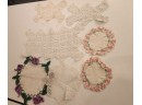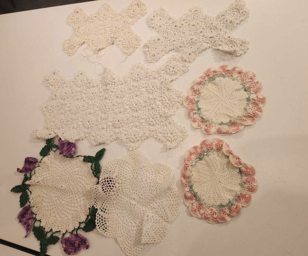 7 pieces of intricate threadwork, including one that was not completed. 4 circular doilies, and 3 geometric pieces that may be intended for protecting furniture.