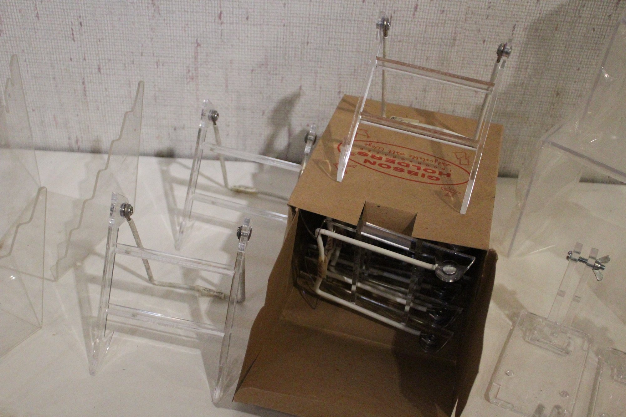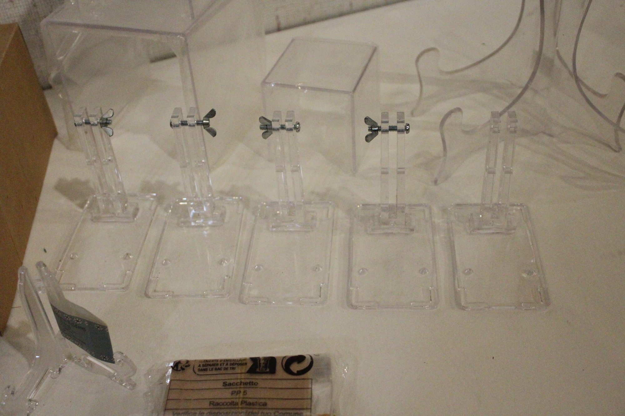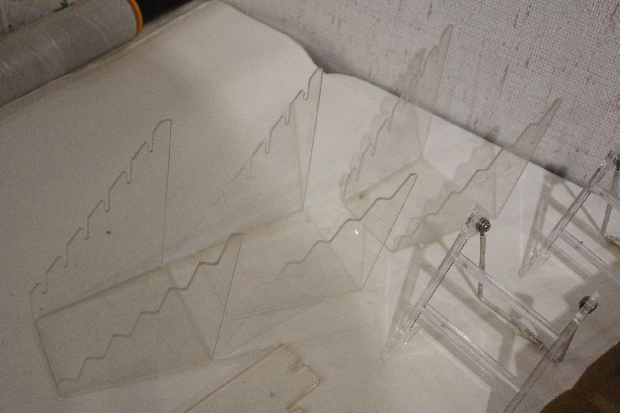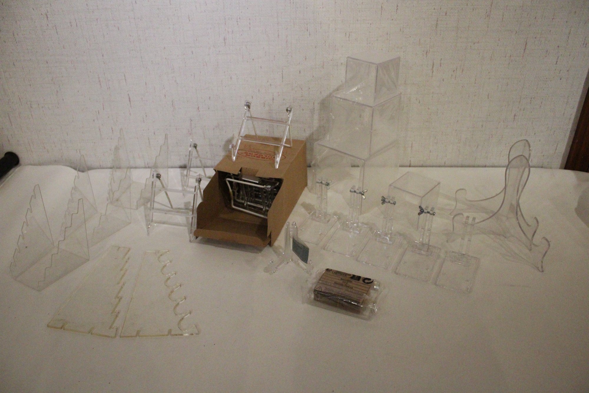 A collection of clear acrylic display stands and easels. 2 acrylic ladder stands, a box of acrylic and wire stands, 4 various sized 3 sided acrylic blocks, 2 acrylic plate stands 7" tall, 1 mini acrylic stand 3" tall, with 5 acrylic stands 1 missing a screw, as well as a package of plastic wrap. These items can be shipped.