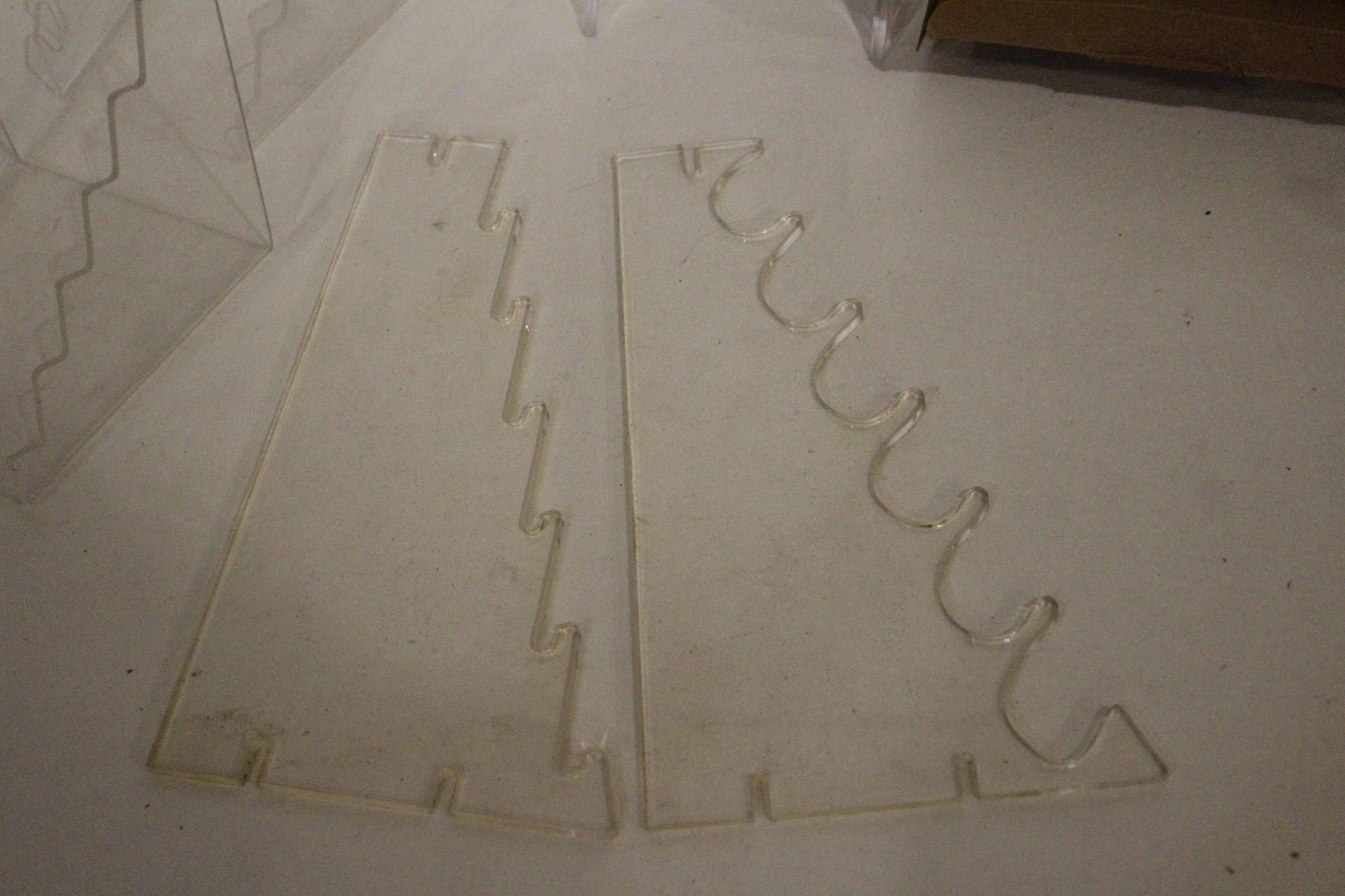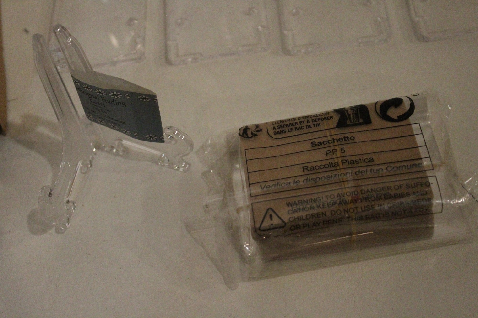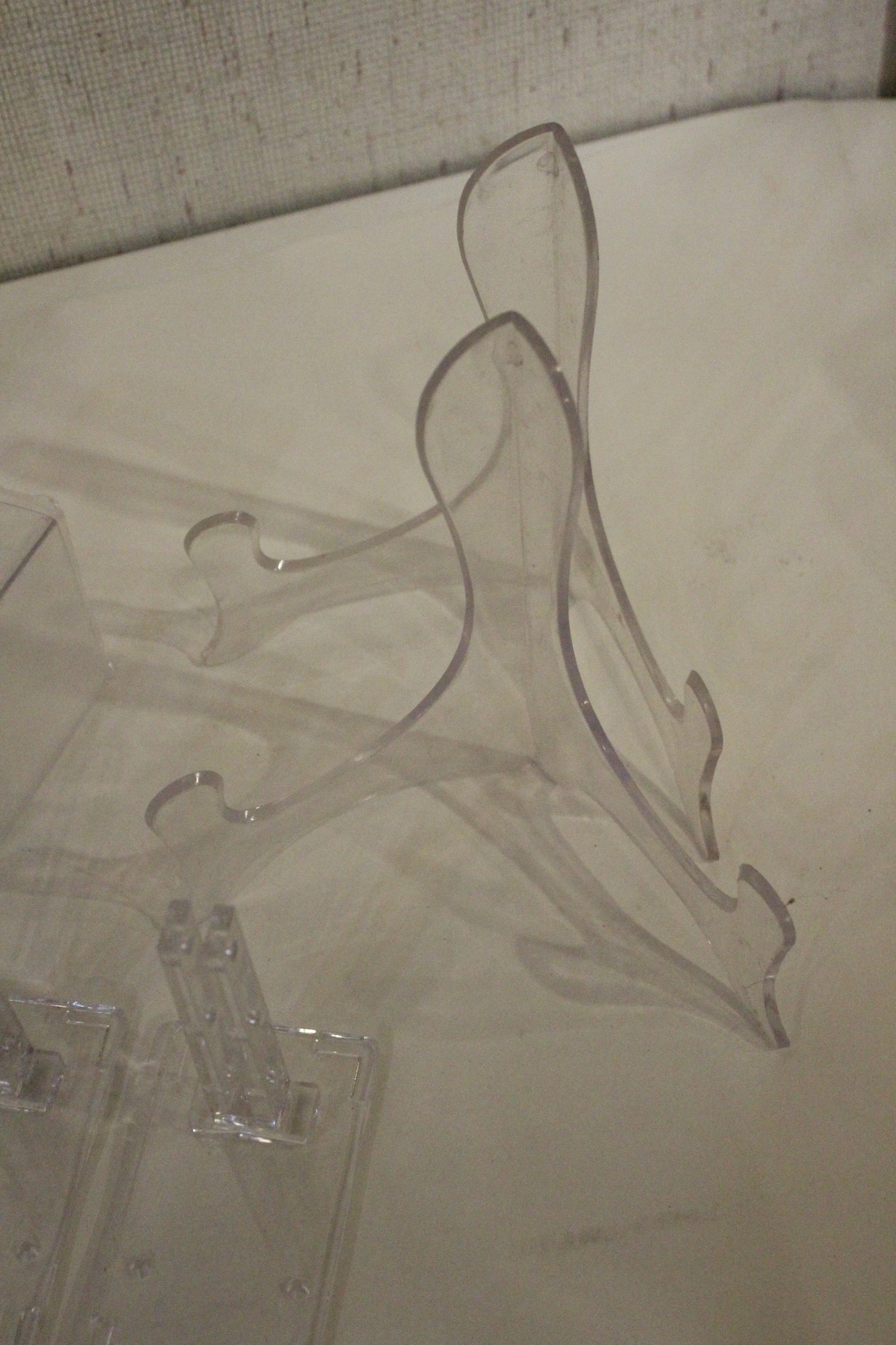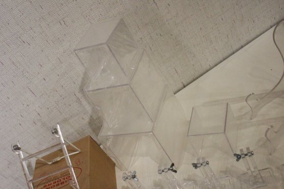 A collection of clear acrylic display stands and easels. 2 acrylic ladder stands, a box of acrylic and wire stands, 4 various sized 3 sided acrylic blocks, 2 acrylic plate stands 7" tall, 1 mini acrylic stand 3" tall, with 5 acrylic stands 1 missing a screw, as well as a package of plastic wrap. These items can be shipped.