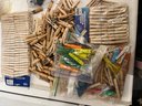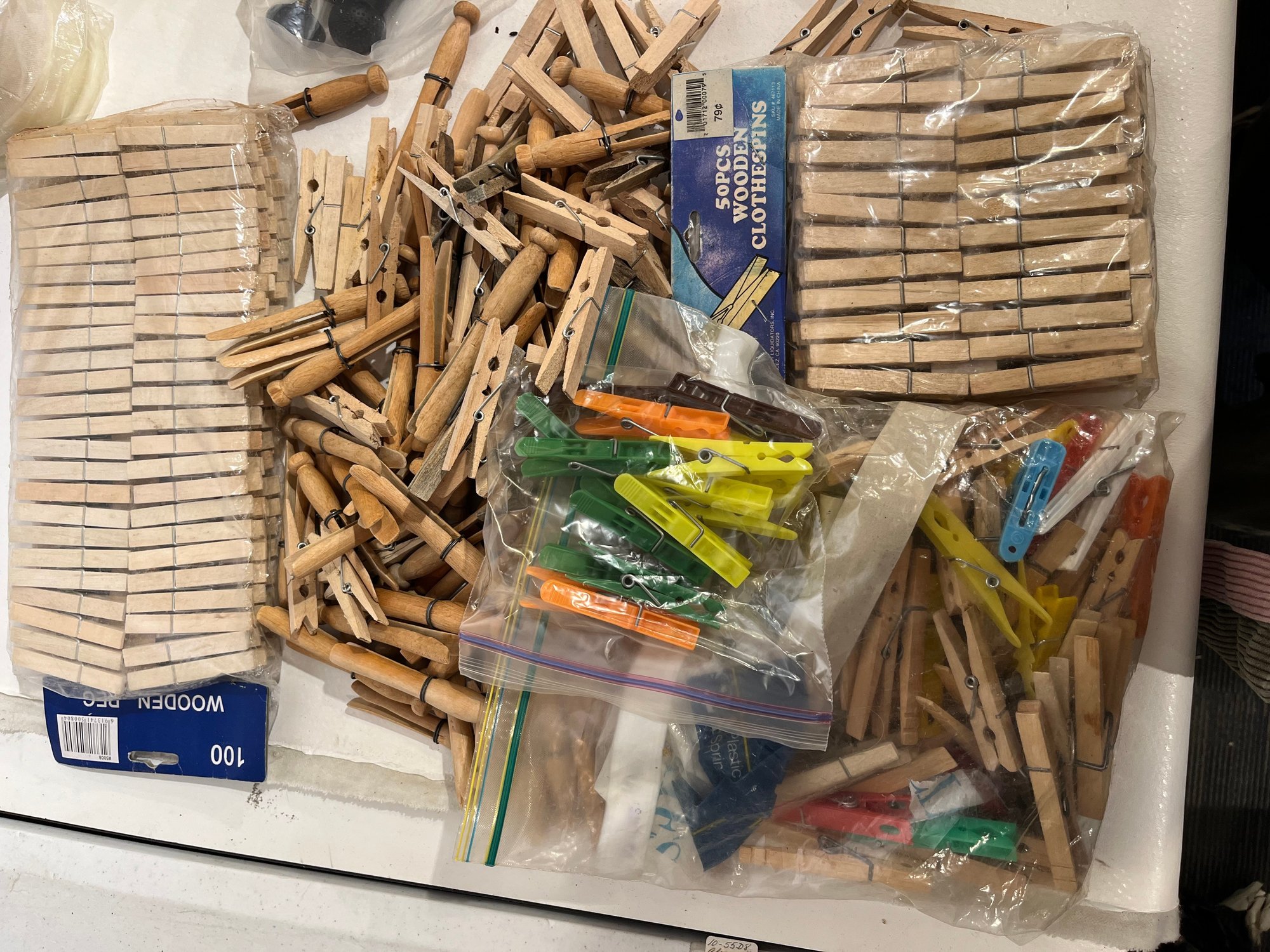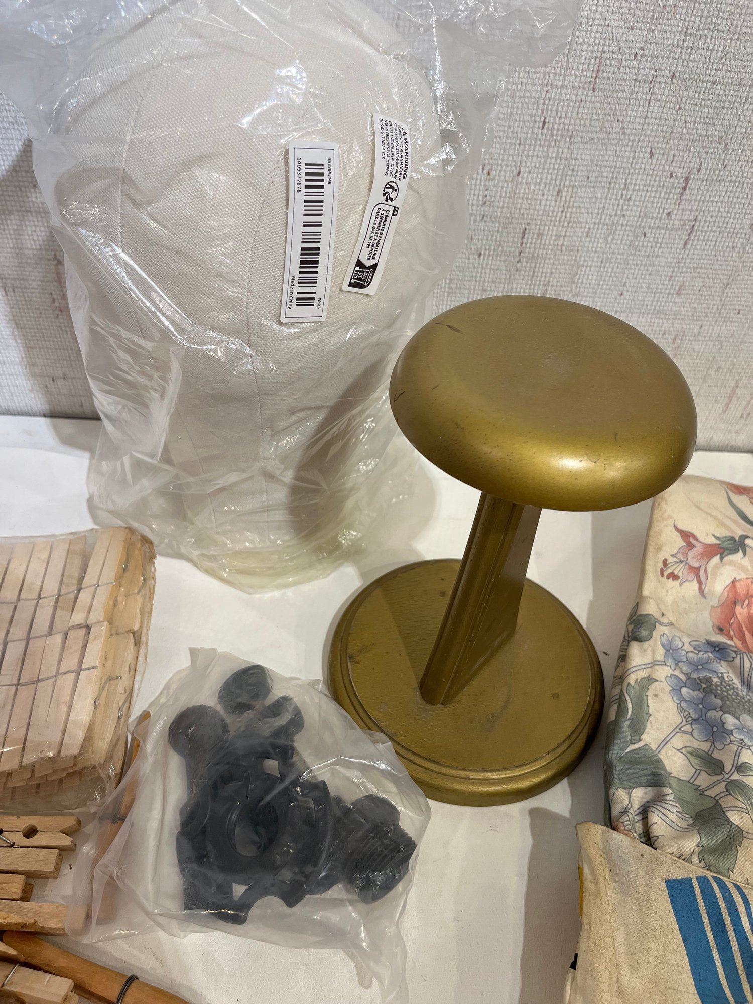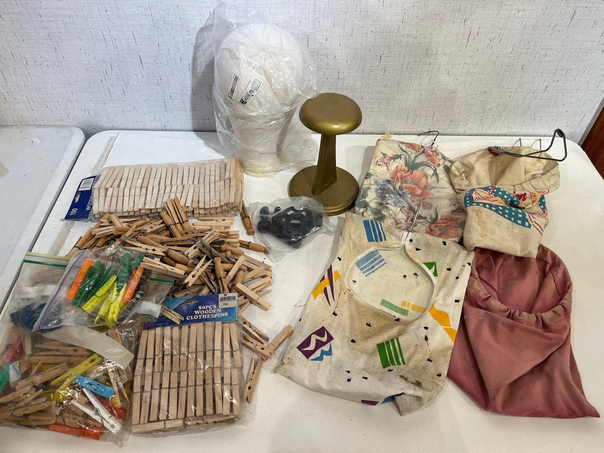 A large amount of Clothes Pins, 4 Bags, and 2 Hat Stands.