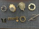 Two gold tone leaves, one with rhinestone flower. 4 circle pins, one with faux pearl. One key pin with a heart and Grandma spelled out in dangling letters and a heart. One butterfly pin with blue and maroon wings