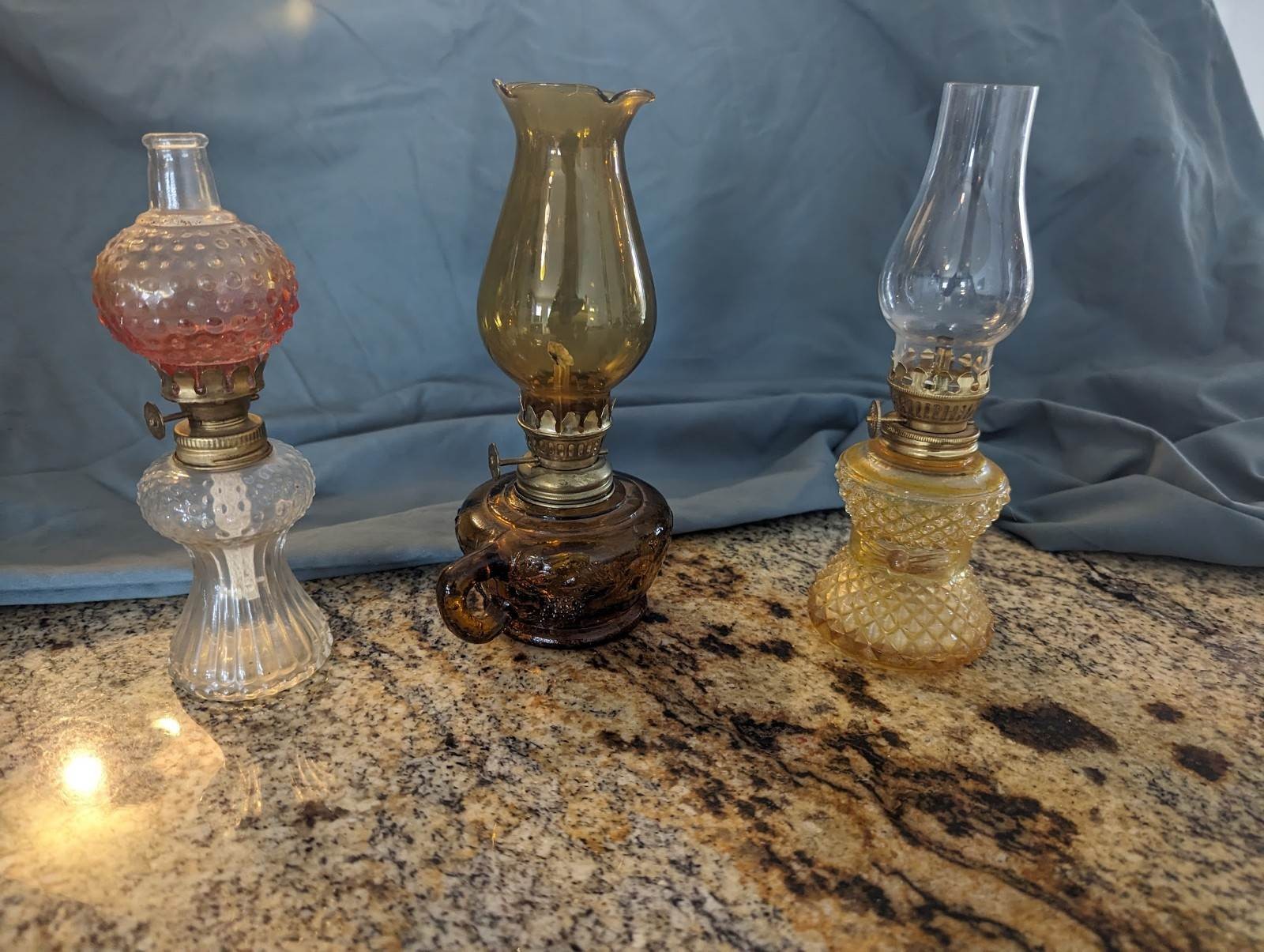1 pink - Traditional portable vintage oil lamp. Used gently. Vintage clear miniature oil lamp with clear hobnail lamp pink ball hobnail bubble lamp. Measurements are approximate . It has a unique look with a rotary knob for turning the wick which uses kerosene. Adding authentic charm to a vintage style interior.