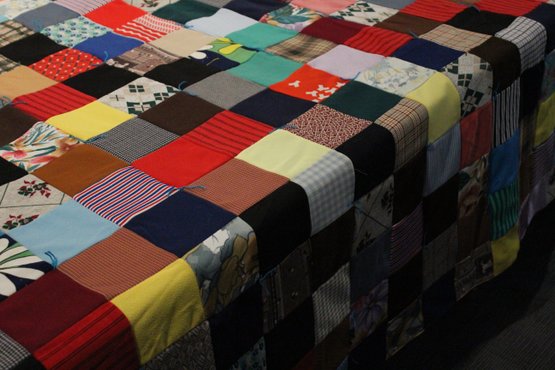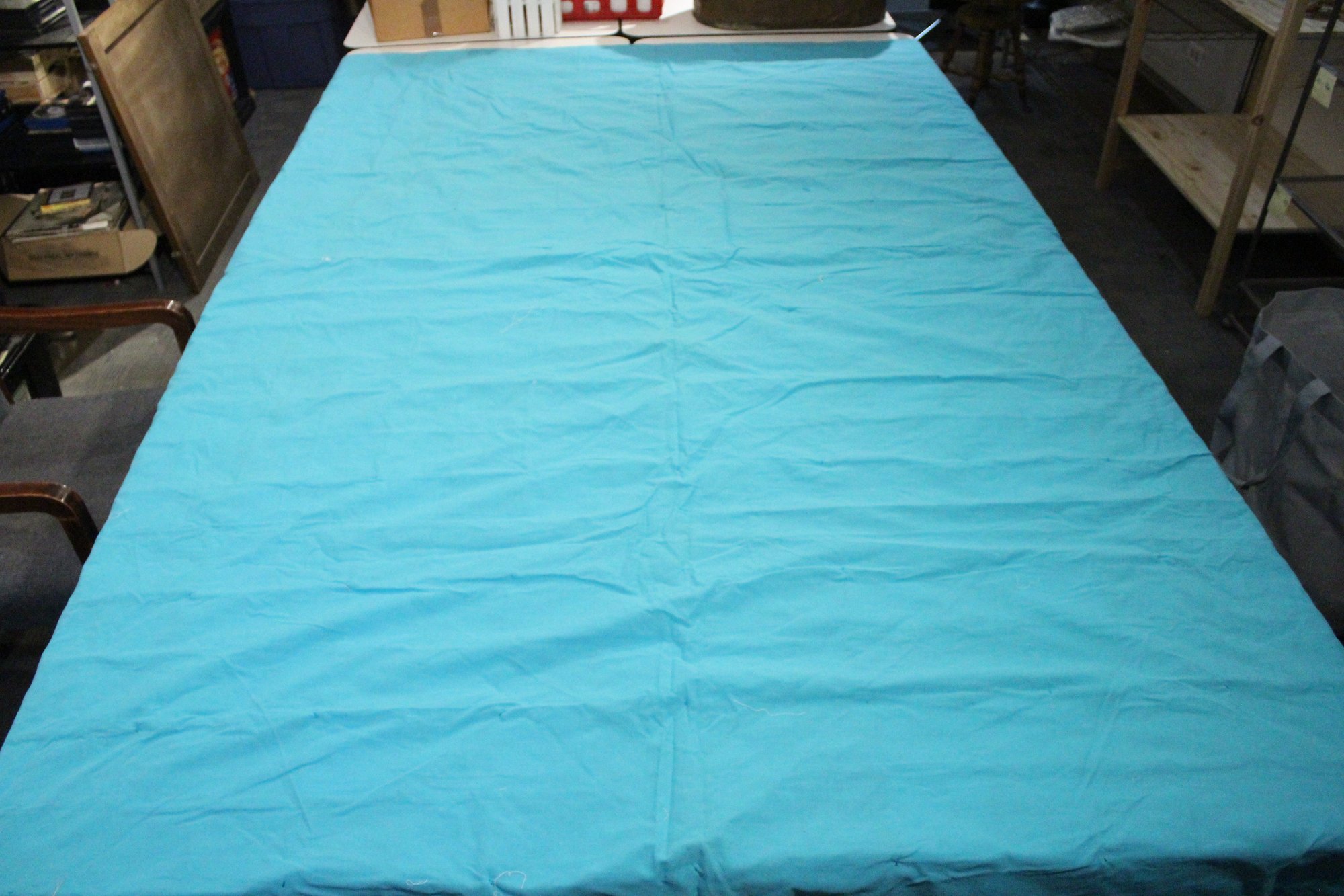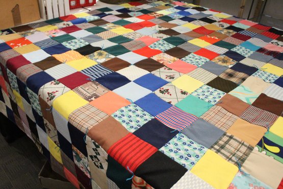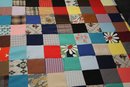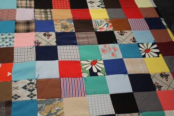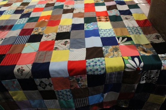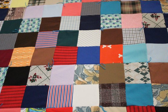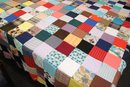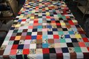 A large handmade quilt featuring many colors and patterns on the top and a teal on the bottom, in excellent condition, 88" x 95". This item can be shipped.