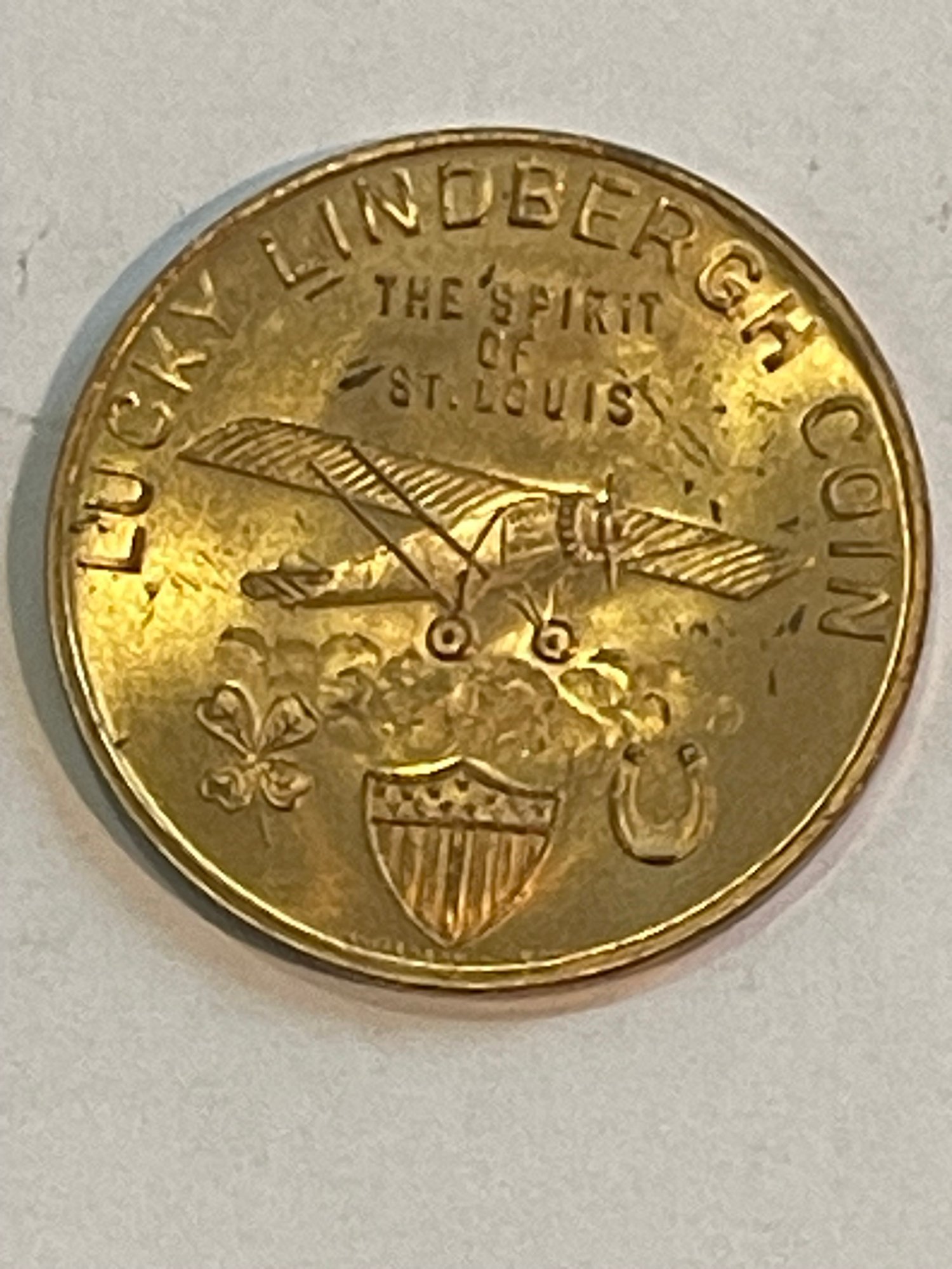 The item shown is a vintage "Lucky Lindbergh" commemorative coin or medal from 1927, celebrating Captain Charles Lindbergh's first solo non-stop transatlantic flight from New York to Paris. 32 mm