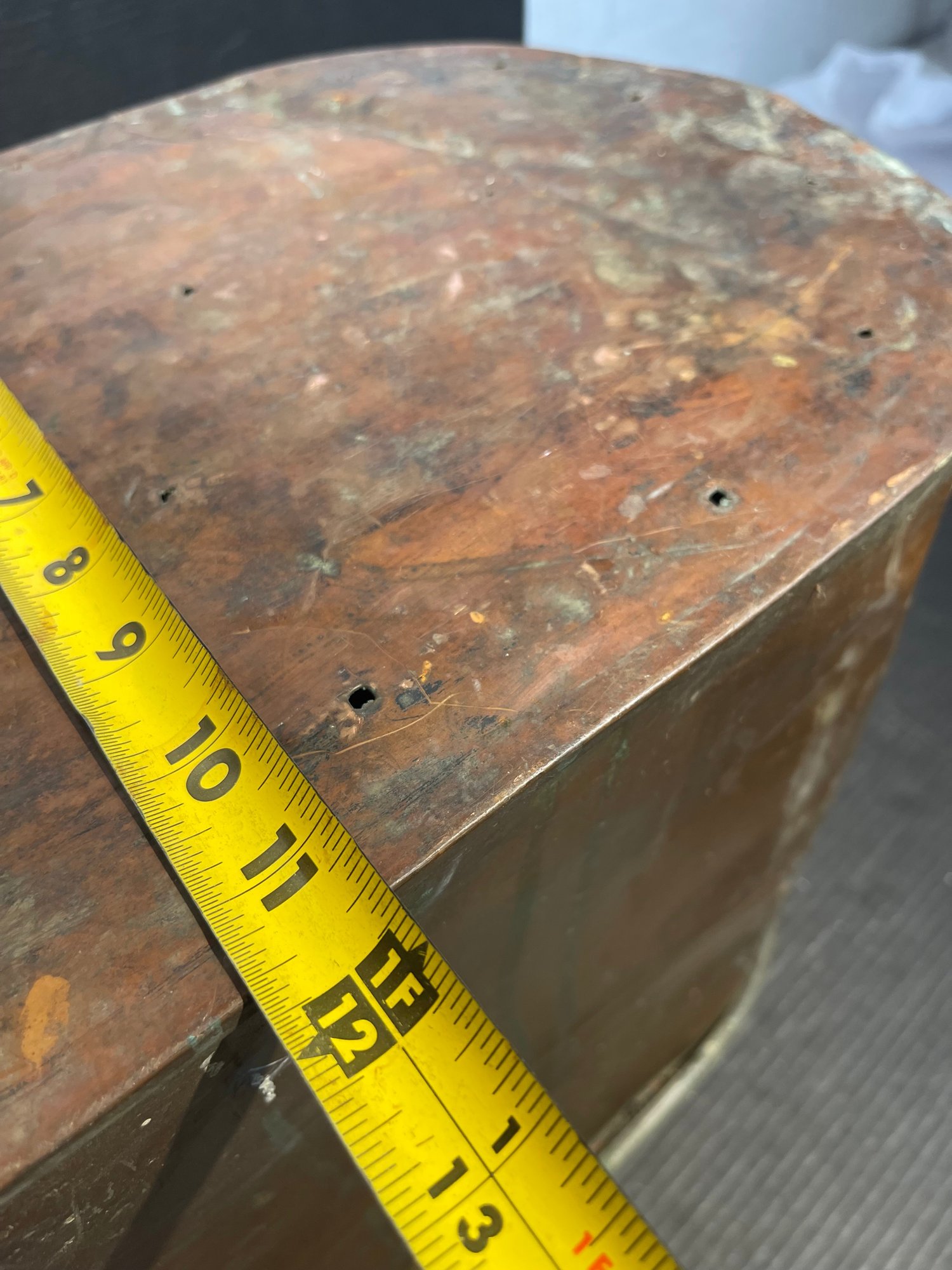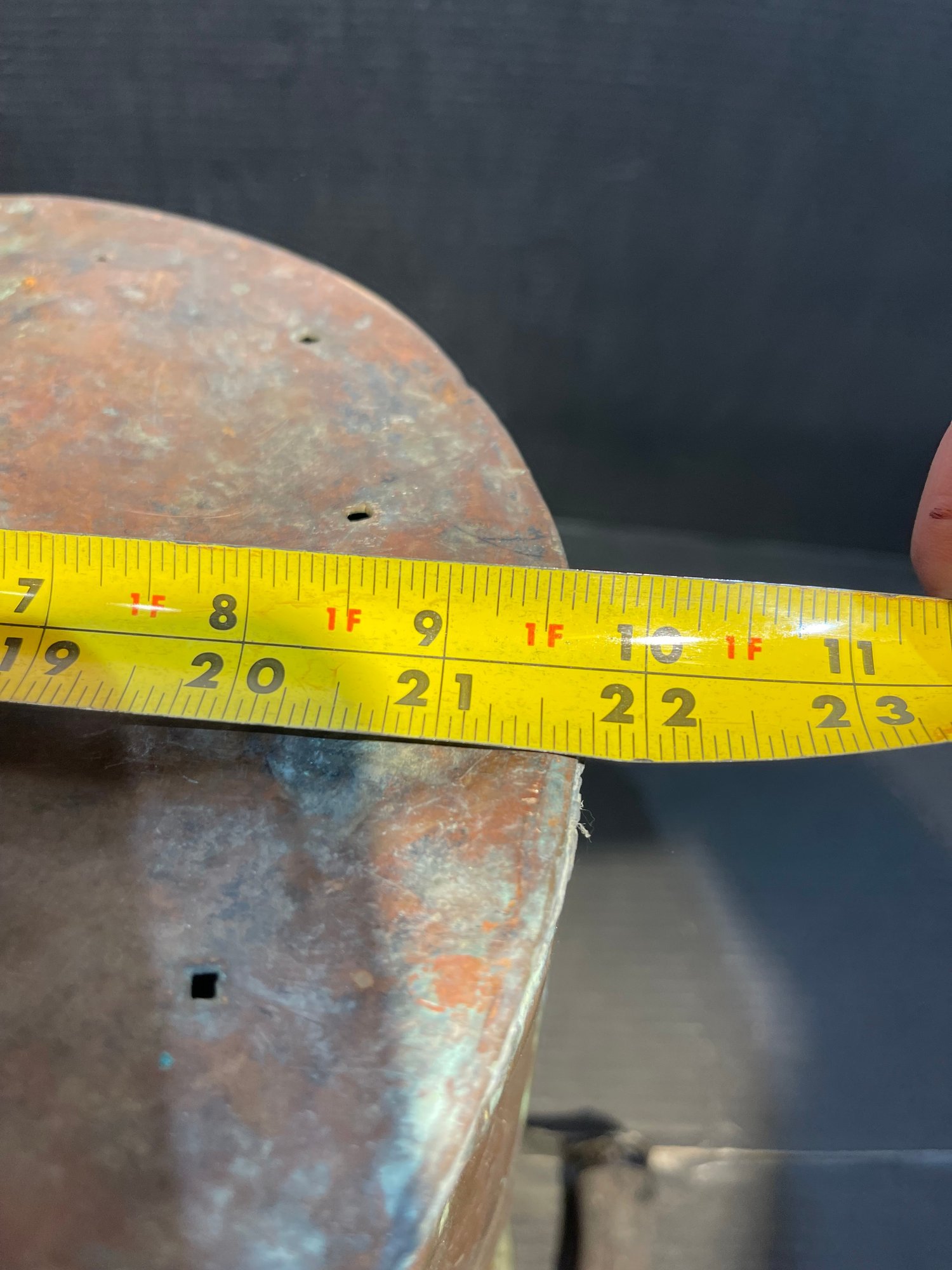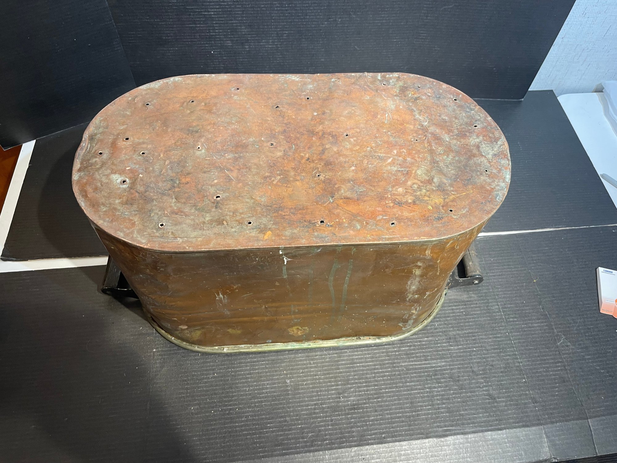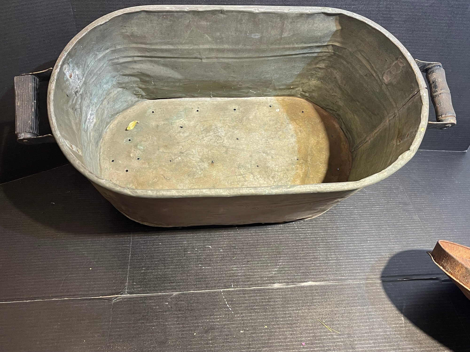 Copper boiling pot , very rustic, with perforations in bottom. over 2 feet wide with handles