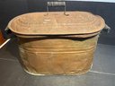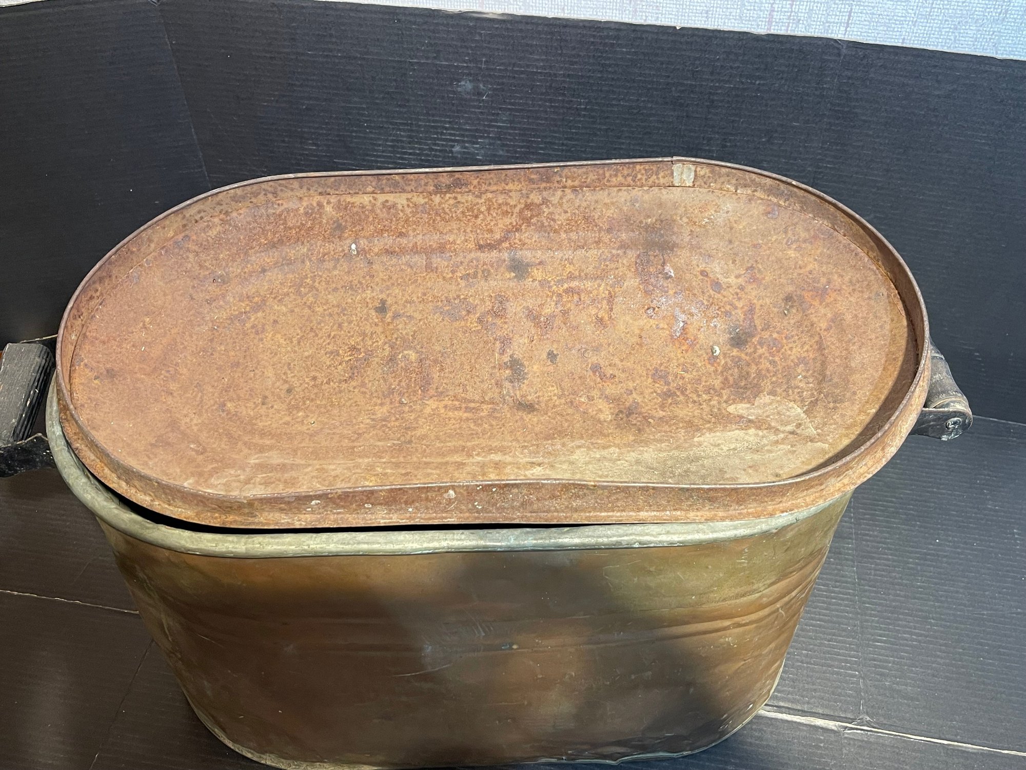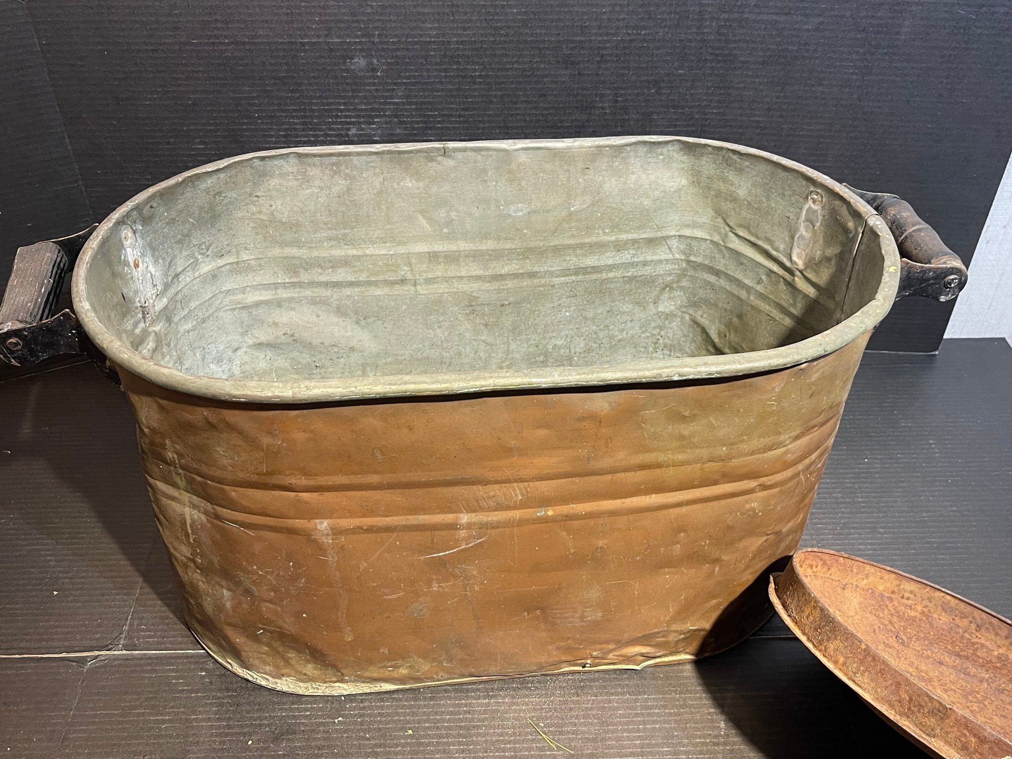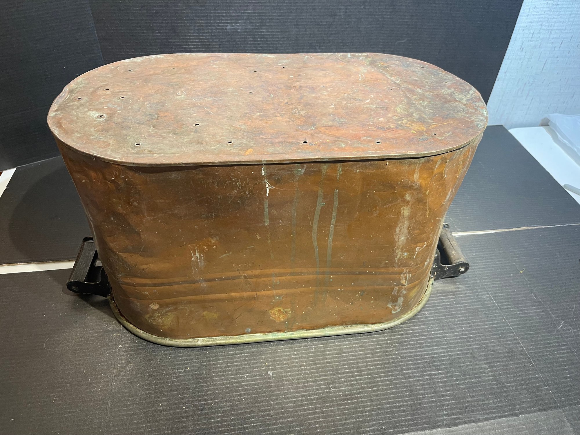 Copper boiling pot , very rustic, with perforations in bottom. over 2 feet wide with handles