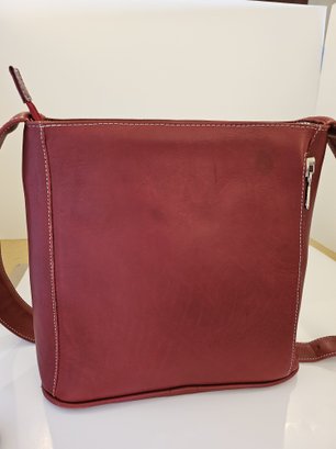 10 x 11 x 5 inch red leather purse, with 2 side pockets ( one with zip closure). 2 sections and 2 interior pockets, shoulder strap. Very nice condition, with 2 very subtle dark areas on back side and vert slight wear around bottom edge.