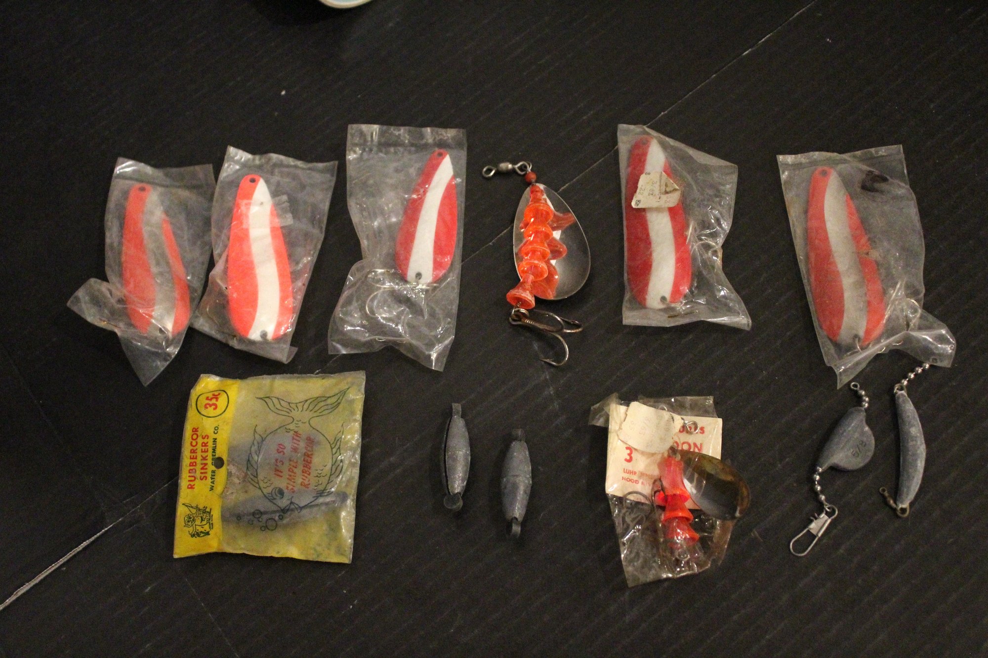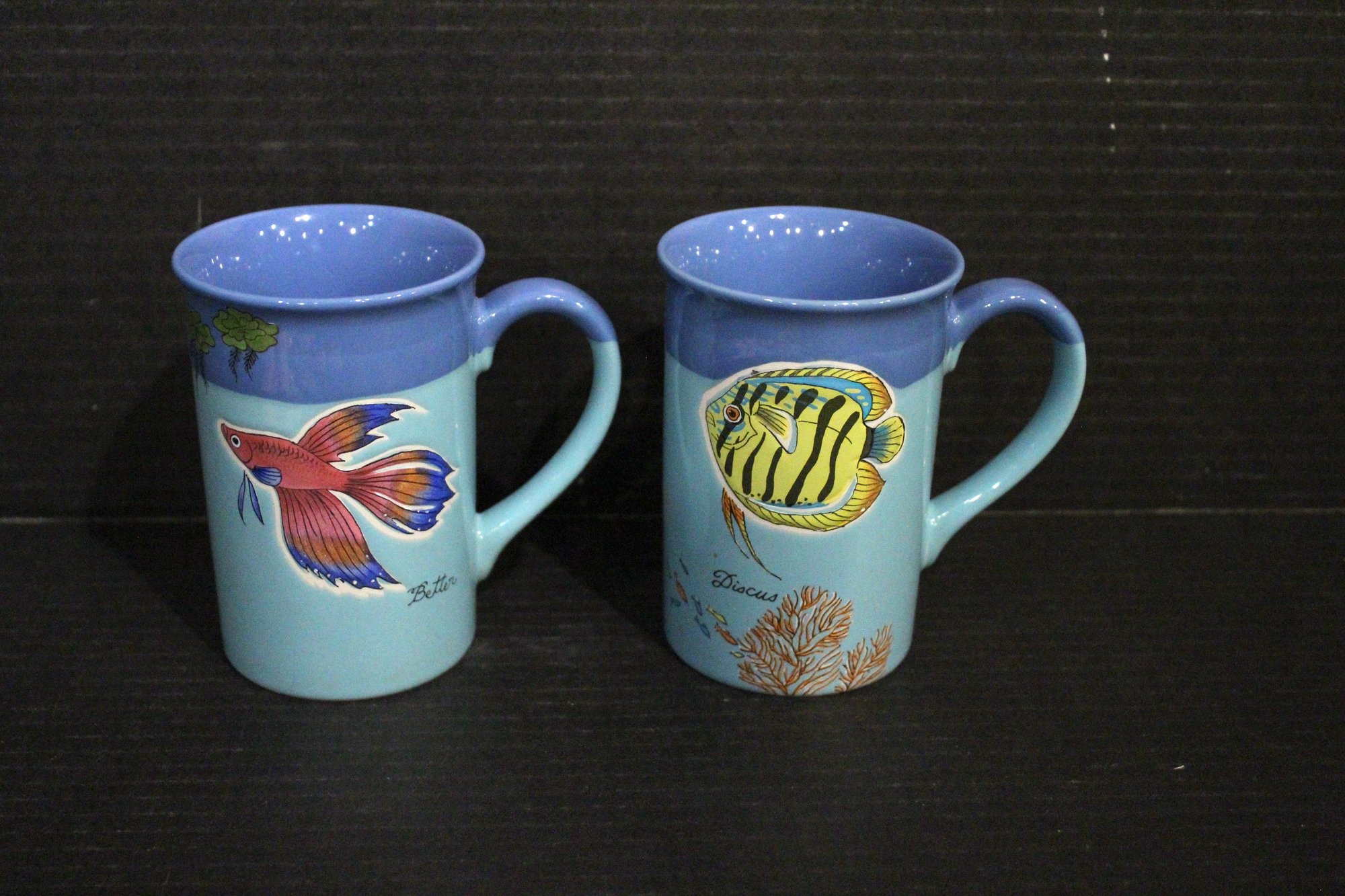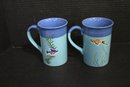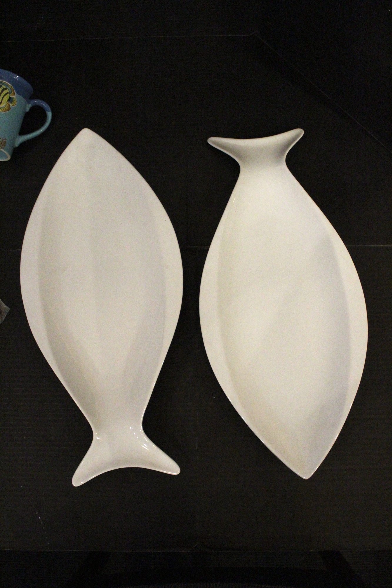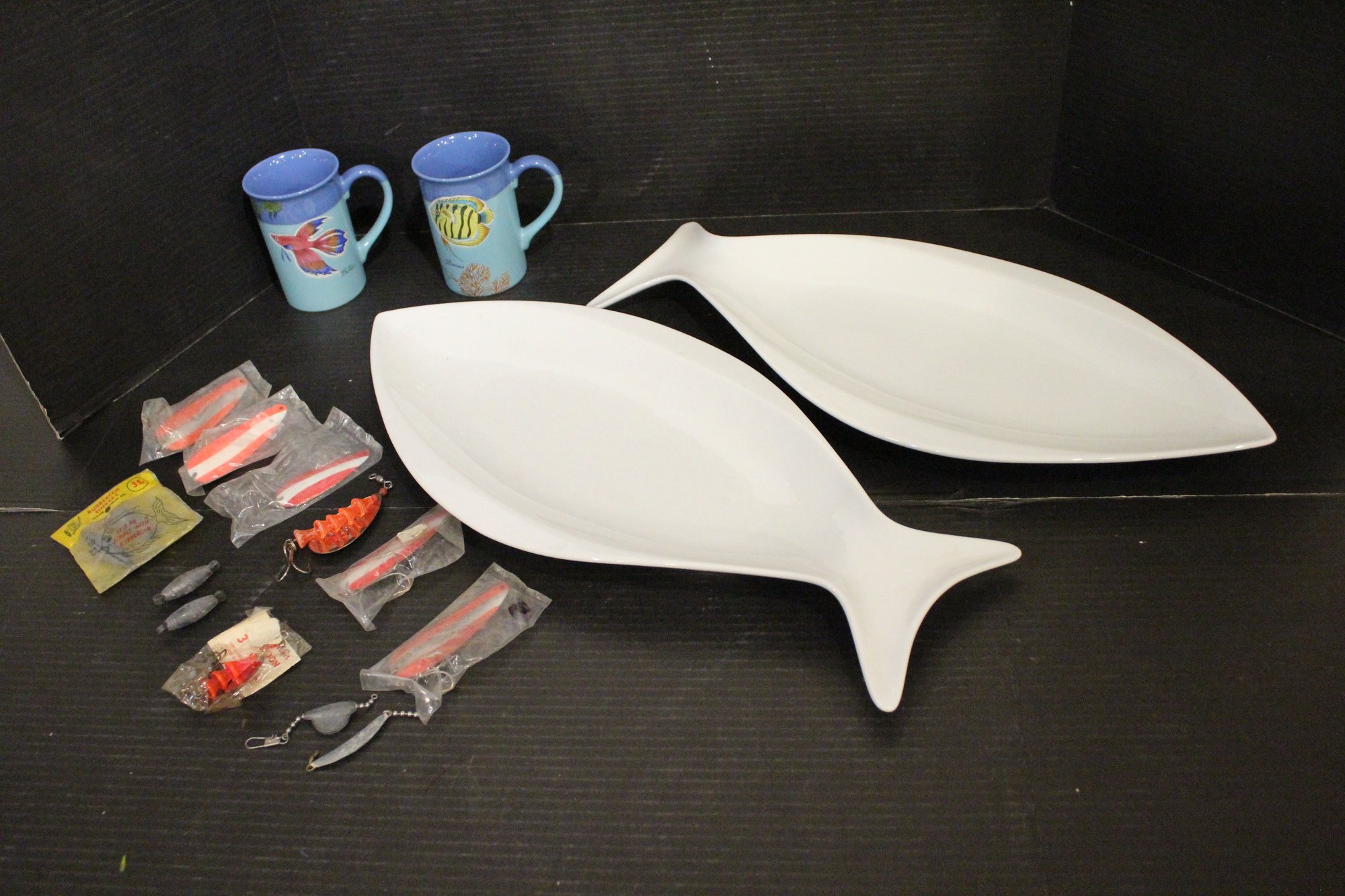 4 vintage Cost Plus turquoise blue etched fish coffee mugs 9oz 4.5" x 3", 7 lures, 6 weights, and 2 Everyday White porcelain fish shaped serving trays, 19" x 9". These items can be shipped.