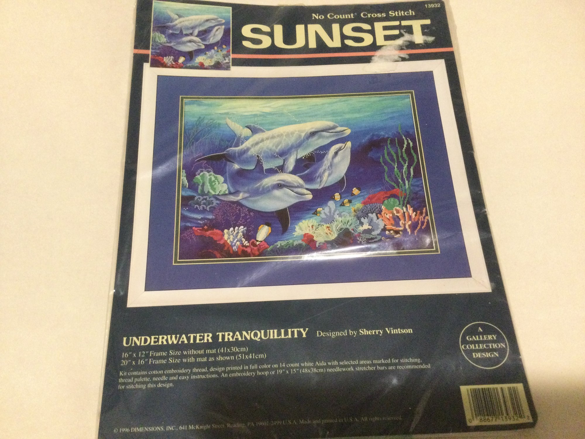 No count cross stitch kit titled “Underwater Tranquility” featuring 3 dolphins and the ocean floor. This kit contains cotton embroidery thread, design printed in full color on white 14 count Aida cloth, thread palette, needle and easy instructions.