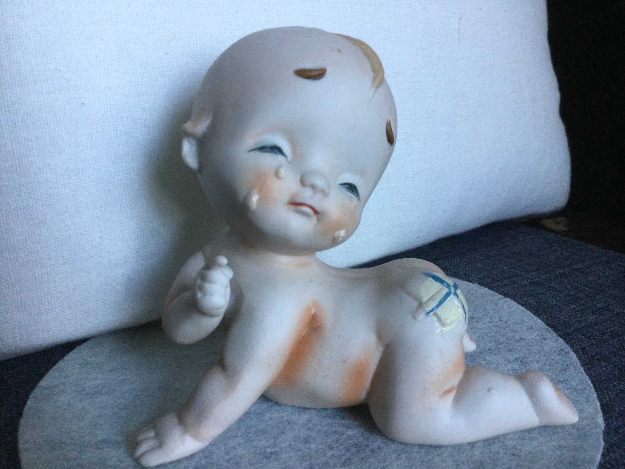 Sad crying Kewpie doll with bandaged bum! Bisque figurine without any markings on the bottom. Super cute little guy/gal, 3 3/4 “ high and 4 1/2” long. He/she seems to be pointing to the cause of the tears.