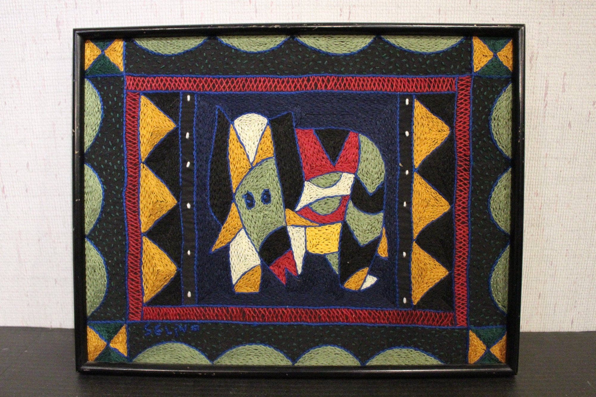 Custom Framed south African folk art, Kaross embroidery of a vibrant elephant