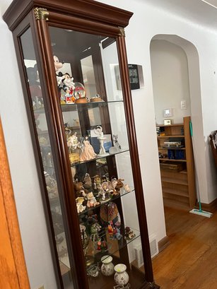Vintage Tall dark wood curio cabinet with glass side door and glass front and side panel. Lighted. Glass shelves removable. (Sorry, I couldn’t take full front view photo due to mirrored back.)