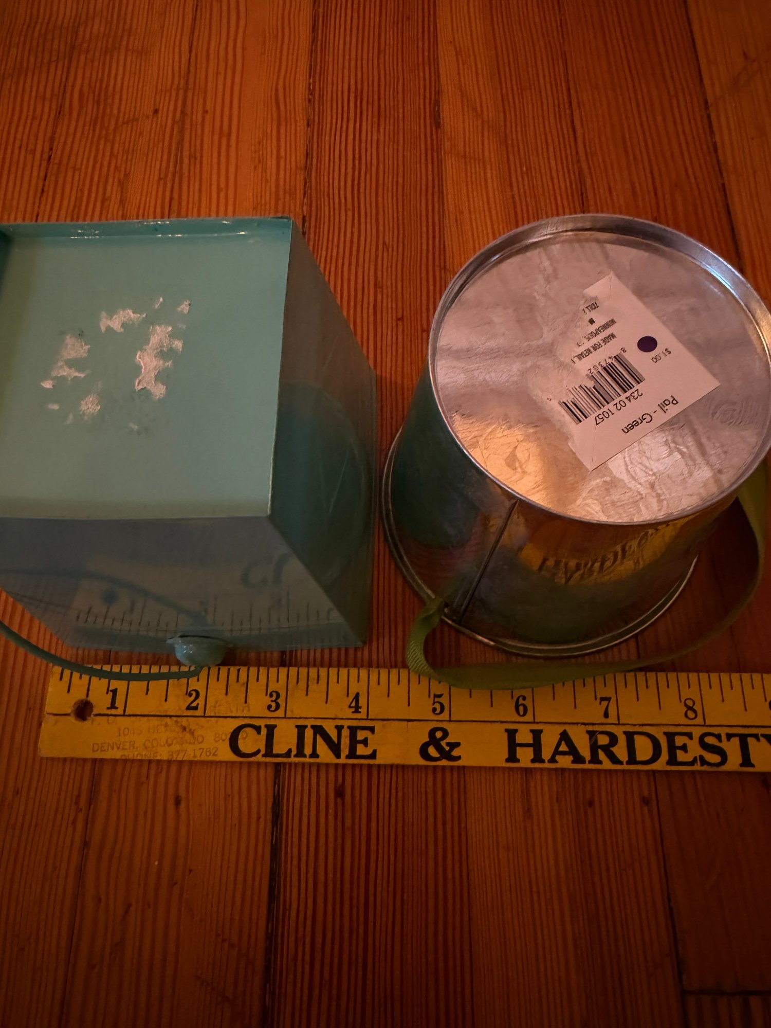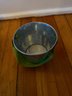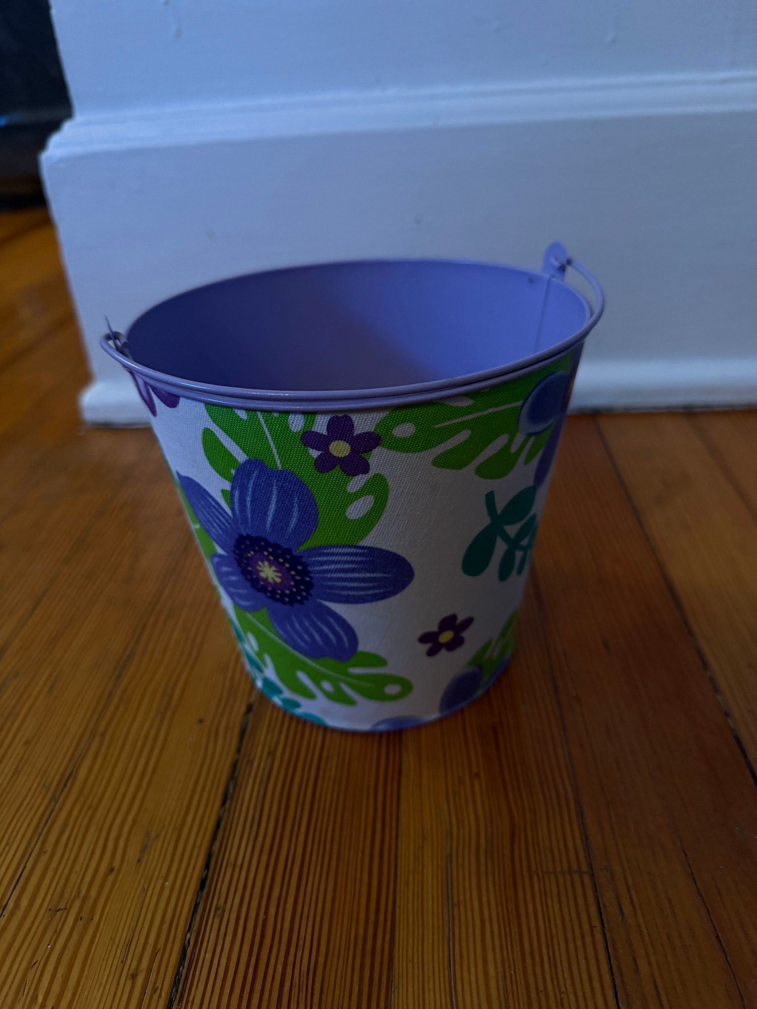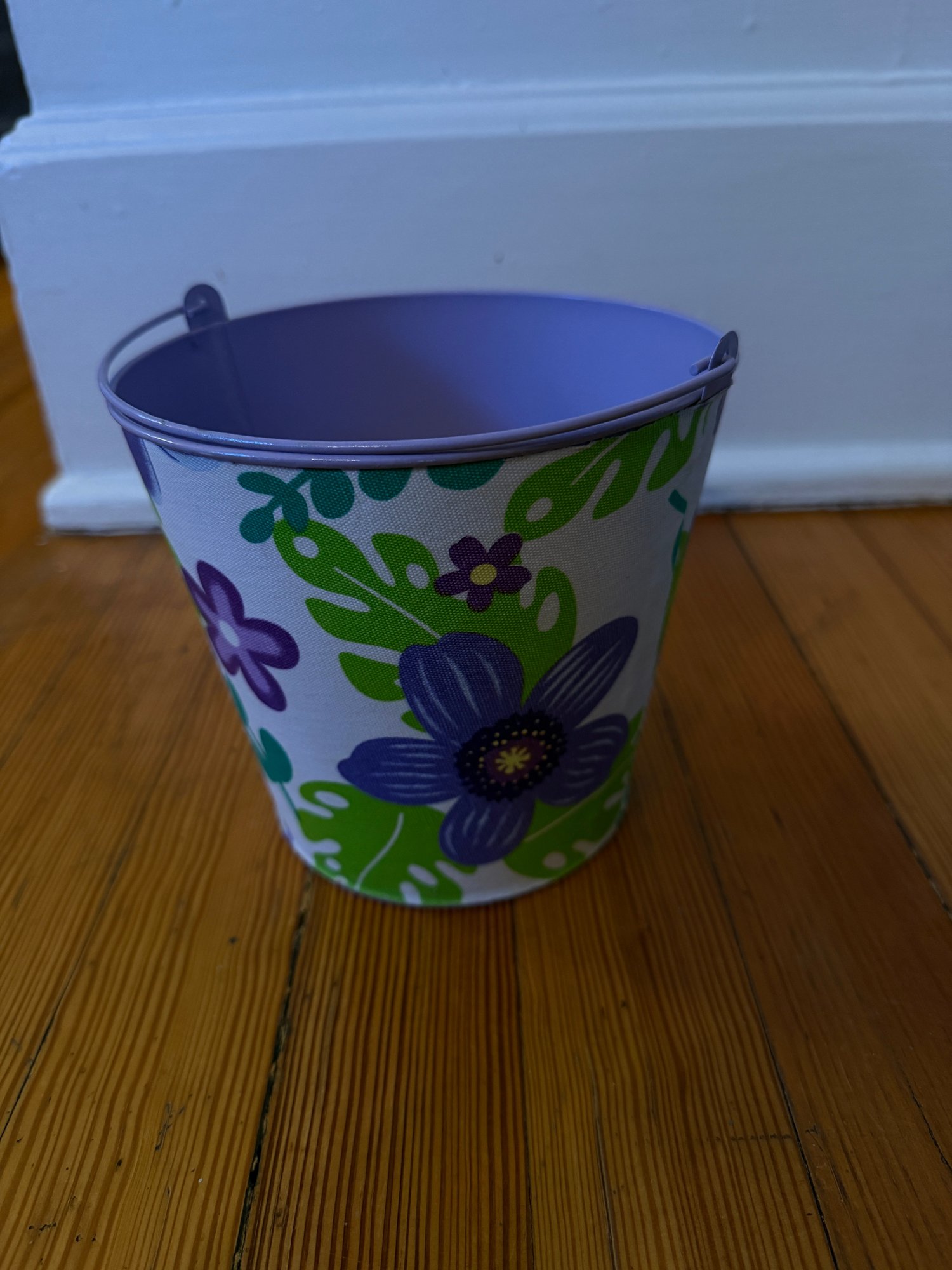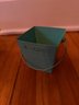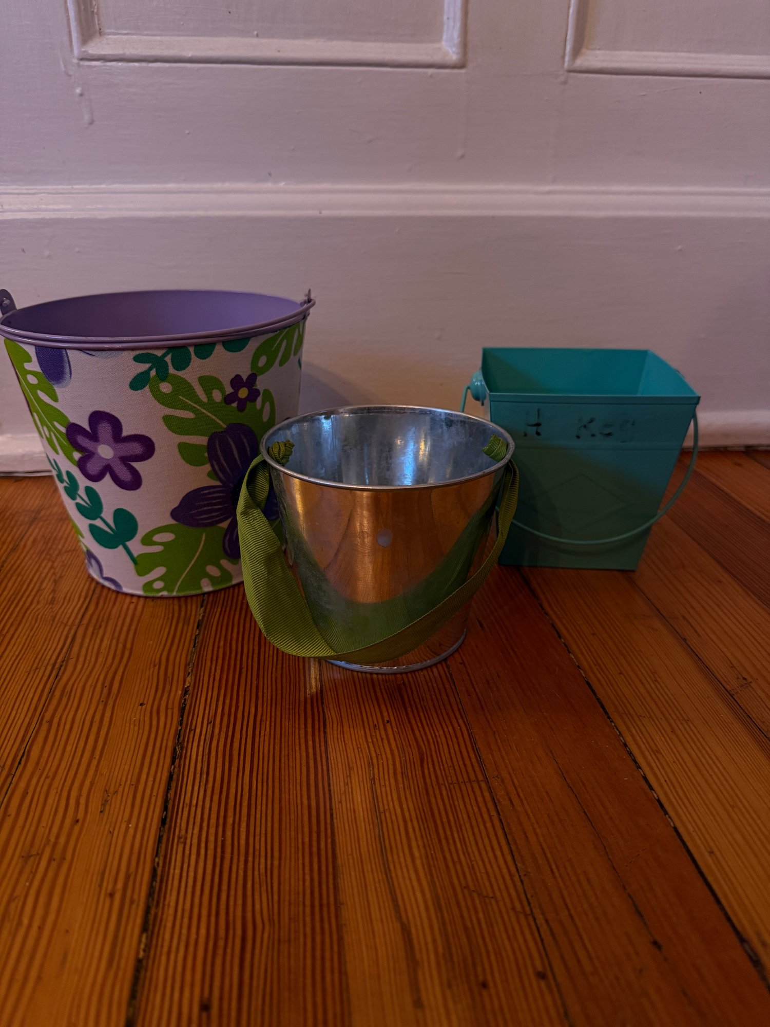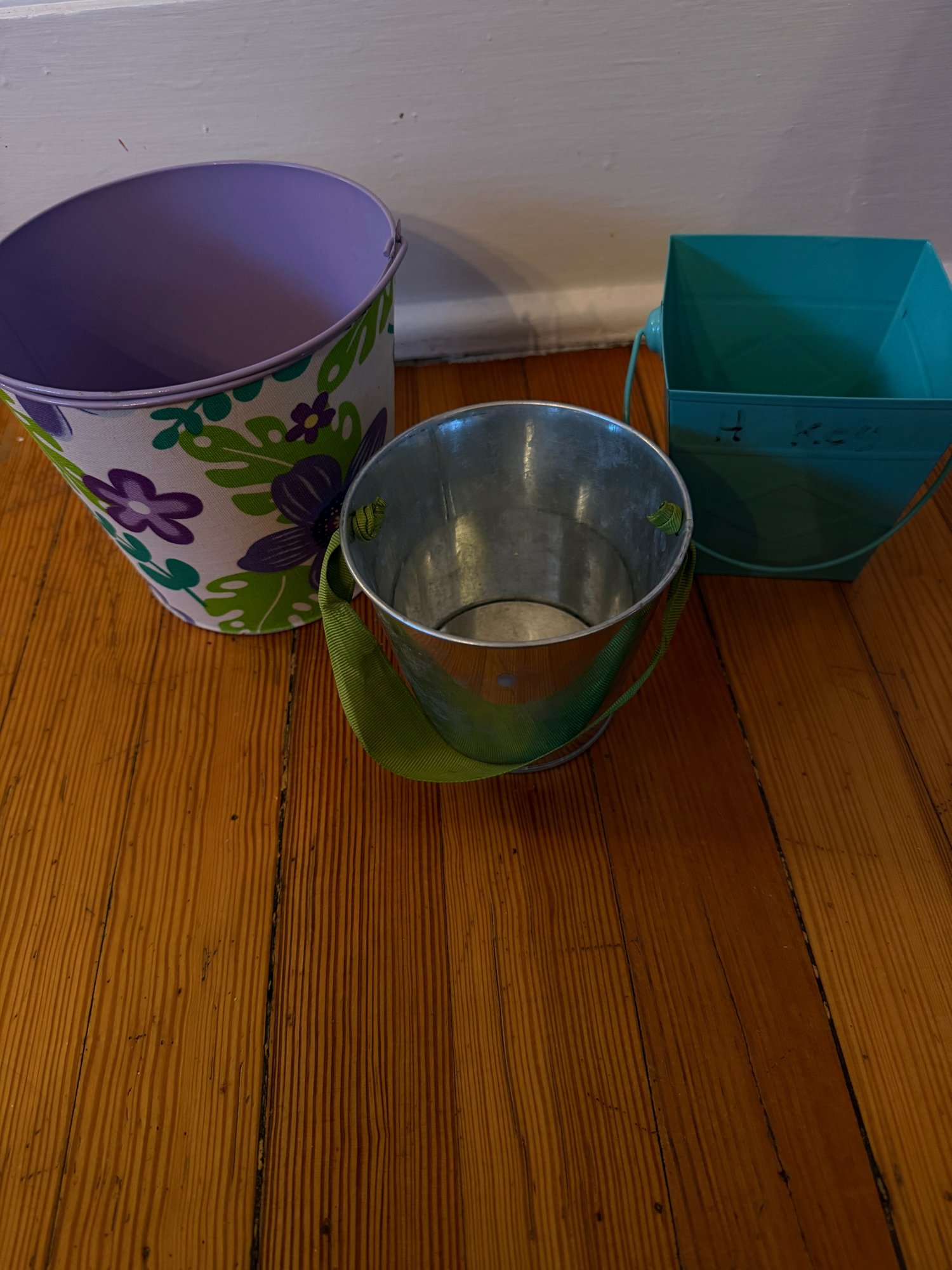 Three decorative pails with handles. One larger, 6 inch in diameter by 6 inch tall lavender pale with flower fabric covering. In great condition very gently used. One 4 inch in diameter by 4 inch tall silver pail with the green ribbon handle. In good condition gently used. And one teal/aqua 4“ x 4“ square by 4 inches tall. Overall, in good condition but some residual writing around the top edge.