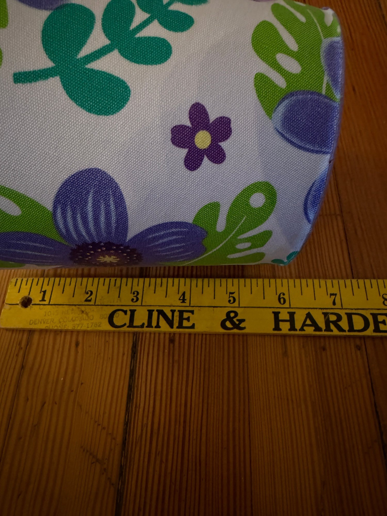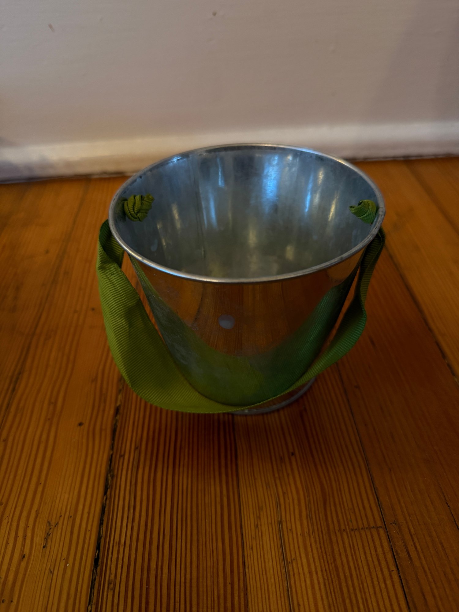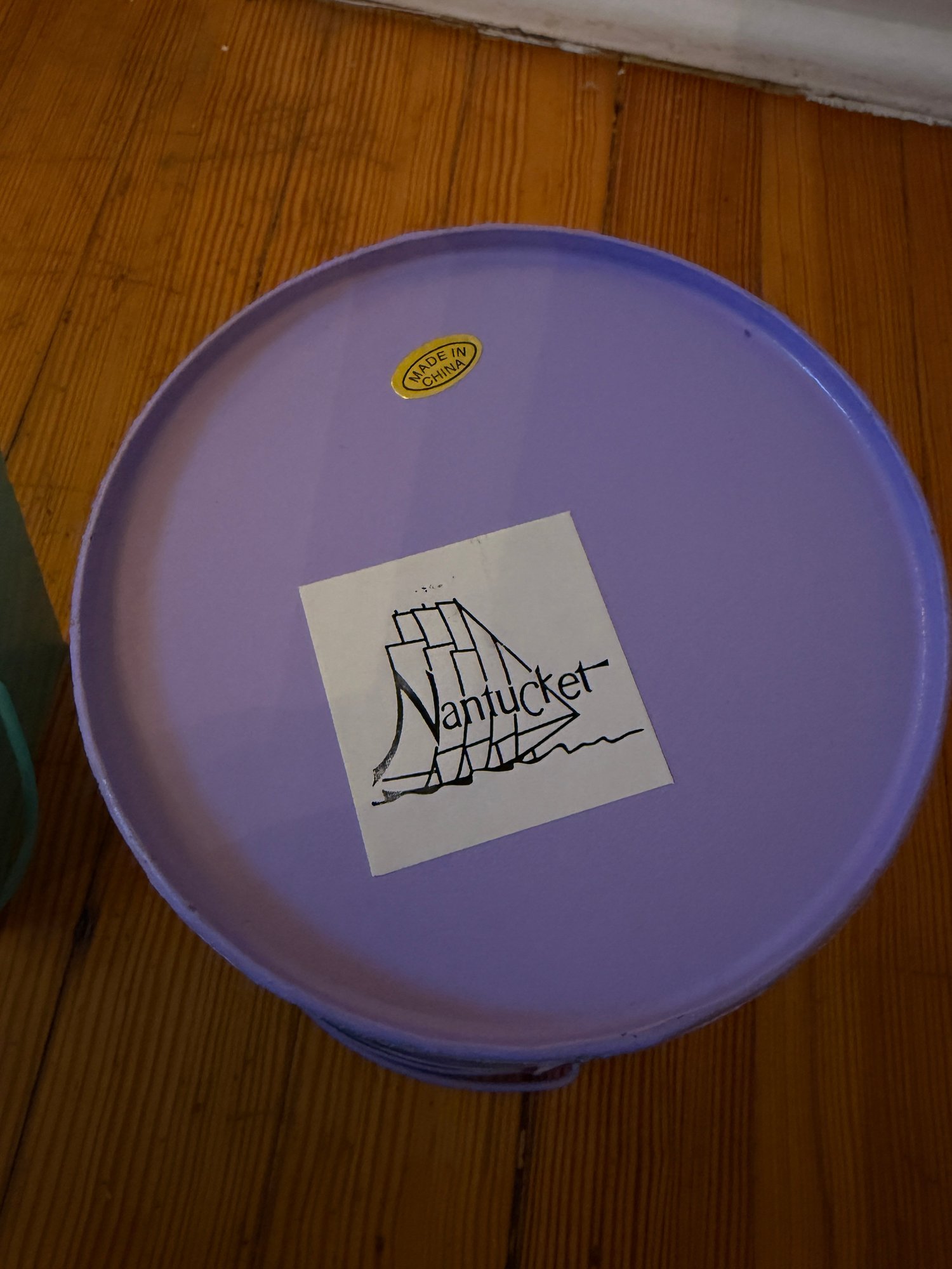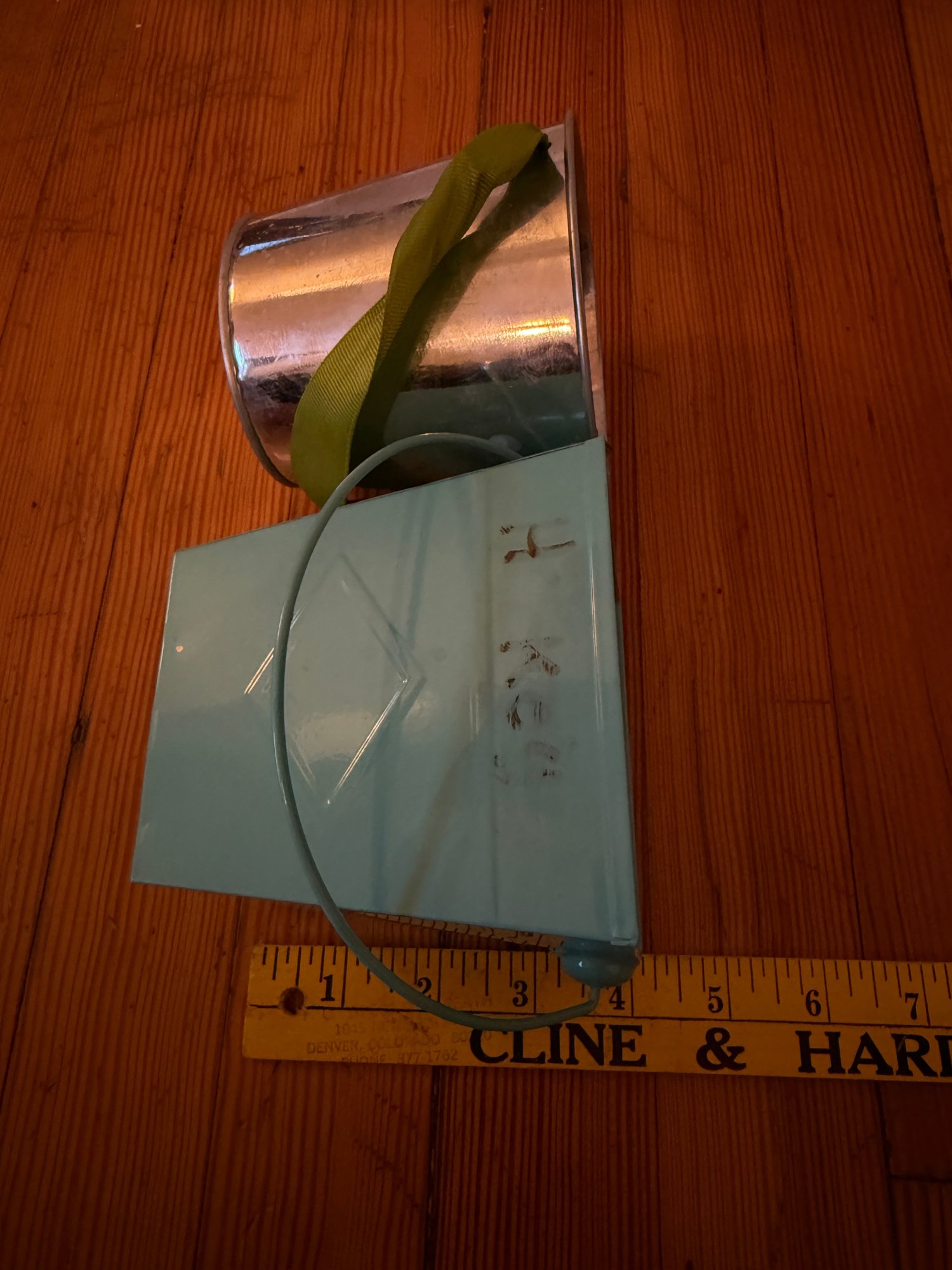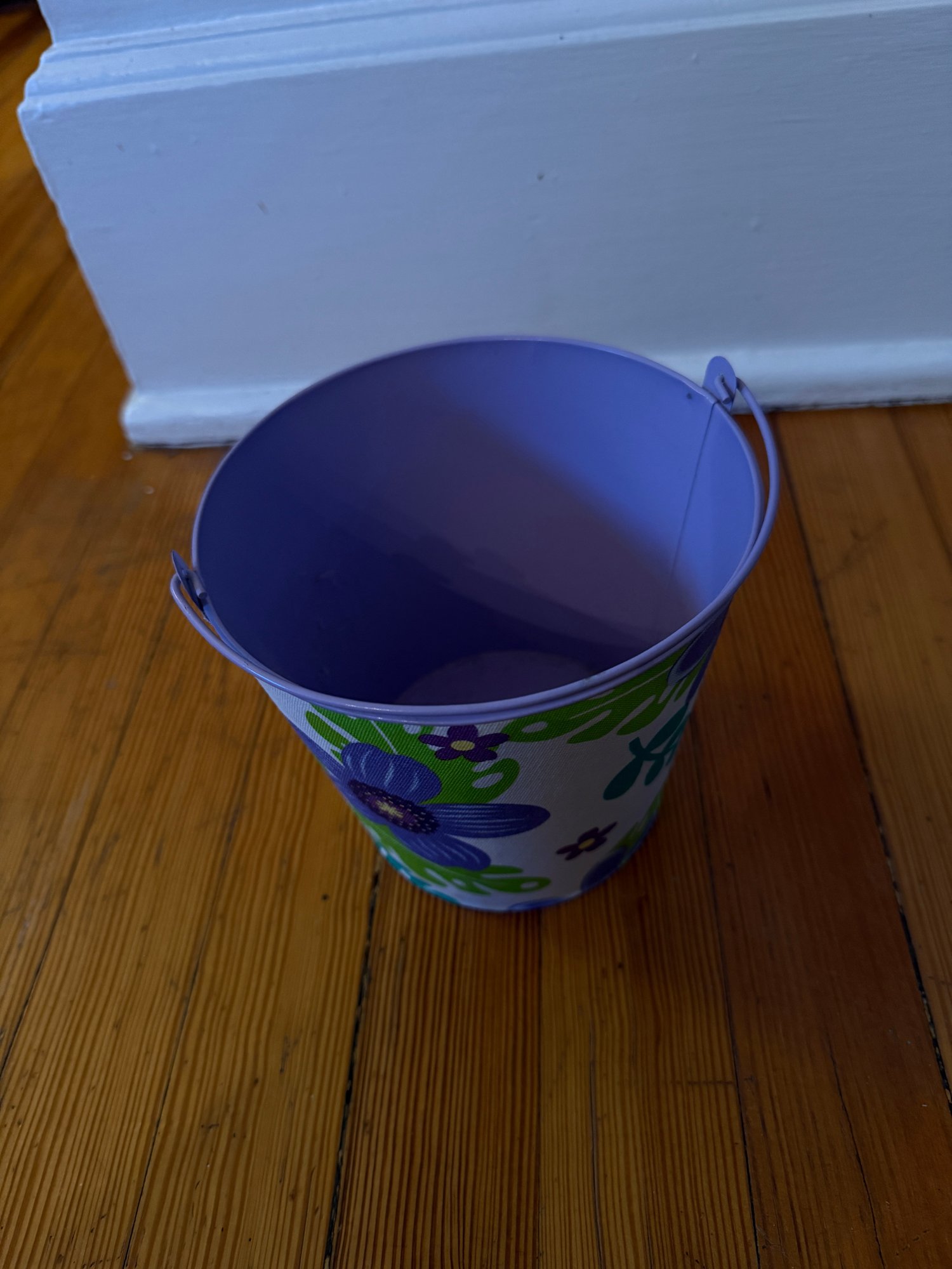 Three decorative pails with handles. One larger, 6 inch in diameter by 6 inch tall lavender pale with flower fabric covering. In great condition very gently used. One 4 inch in diameter by 4 inch tall silver pail with the green ribbon handle. In good condition gently used. And one teal/aqua 4“ x 4“ square by 4 inches tall. Overall, in good condition but some residual writing around the top edge.
