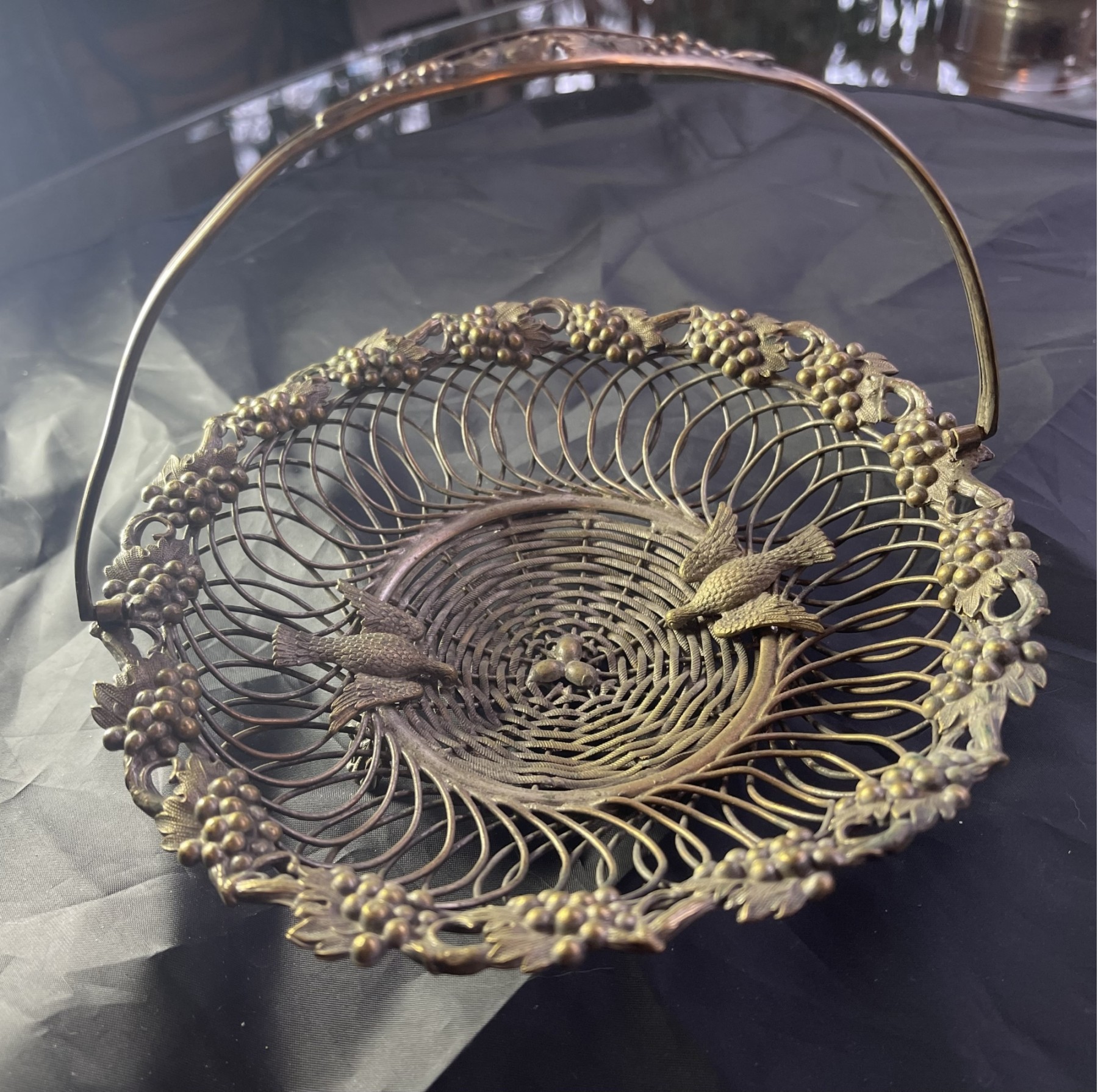 8 inch diameter wire basket with grapevine border and 2, 3 dimensional birds.