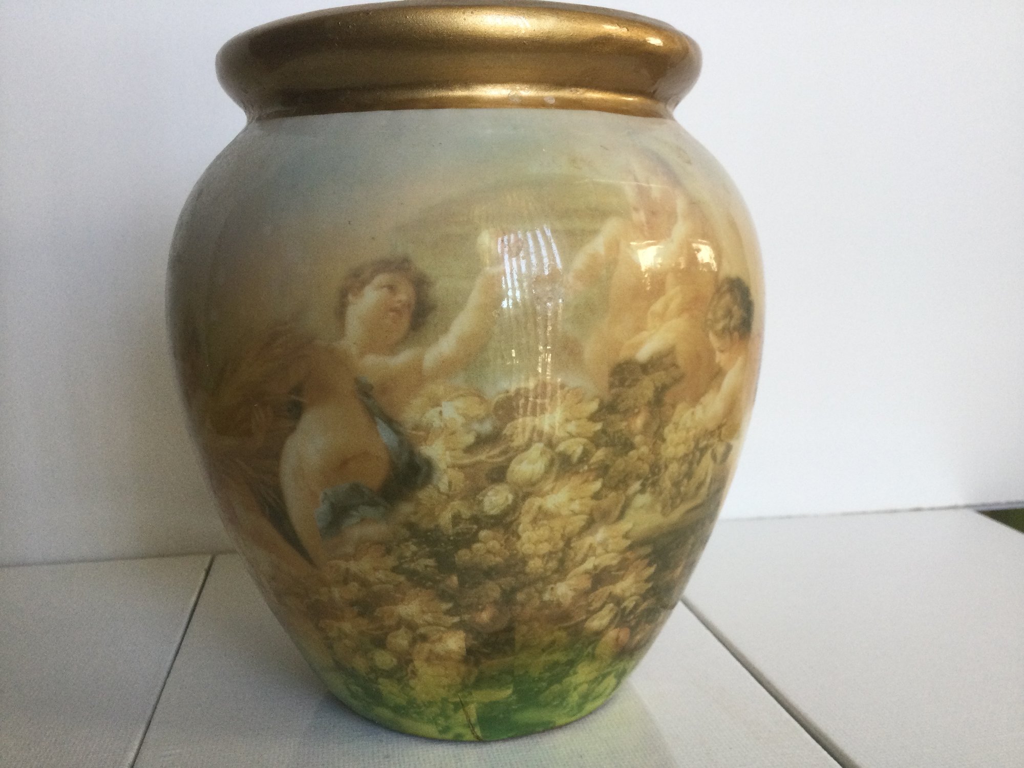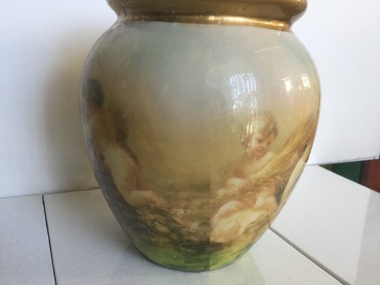 Decoupage vase with cherubs all around it playing in flowers with made in China tag on the bottom.