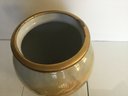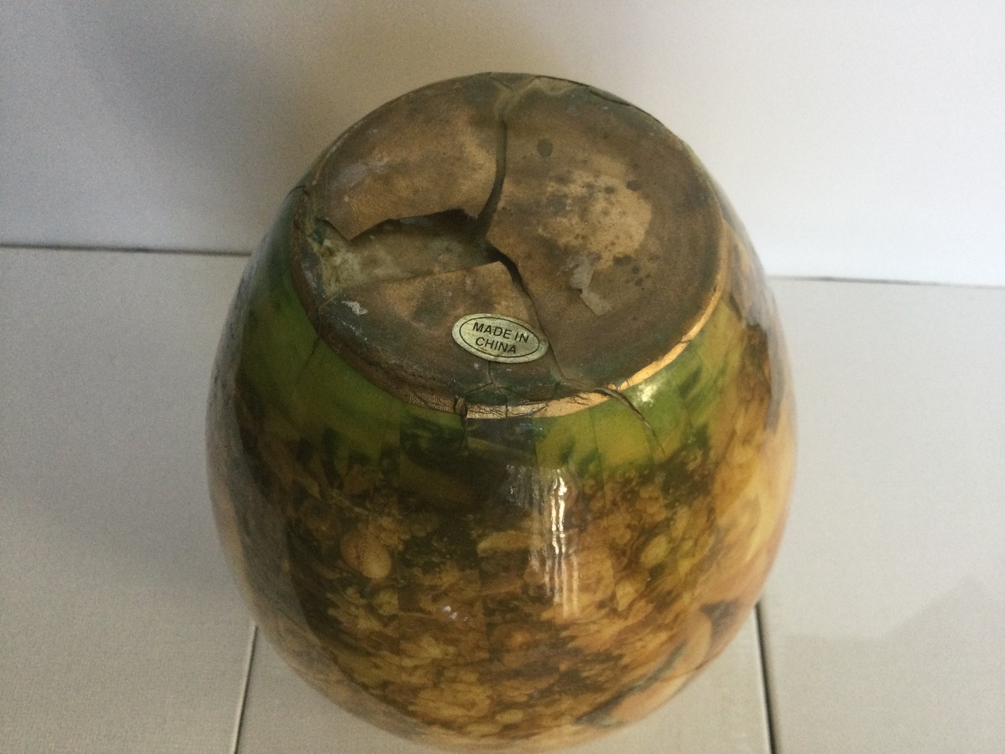 Notes: Gold edge is brown in some places on the rim, fading where overlay of decoupage is coming loos on the bottom, discolored on the inside of vase