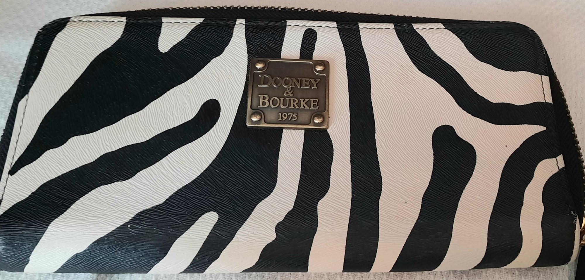 Dooney & Bourke wallet in great condition. It measures 7.5 inchs by 3.5 inches. Design is black and white. Has lots of room for all you items.