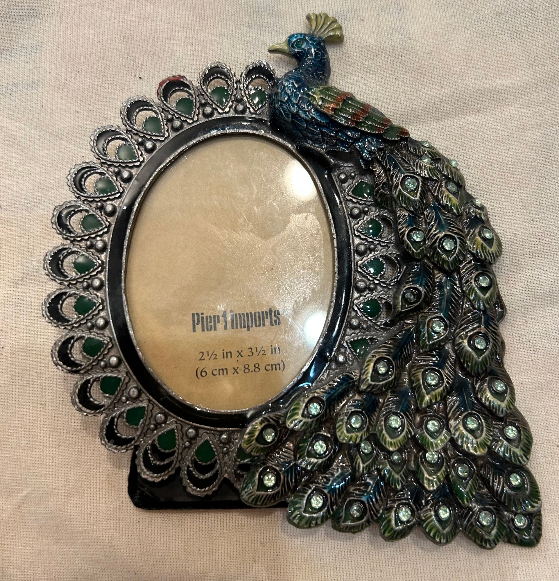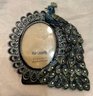 From Pier One, a metal peacock frame , 6 inches tall and wide