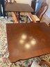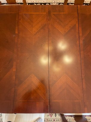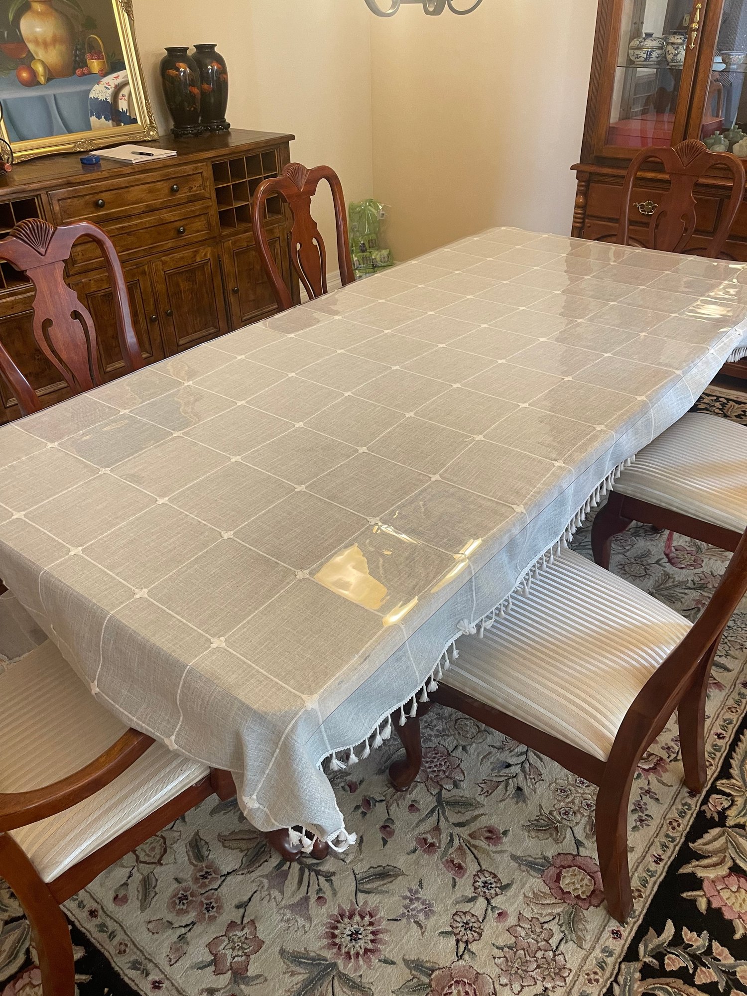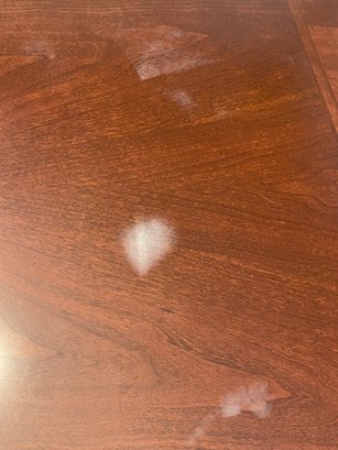 There are a few superficial heat marks that can easily be removed. Clear protective cover and tablecloth included.