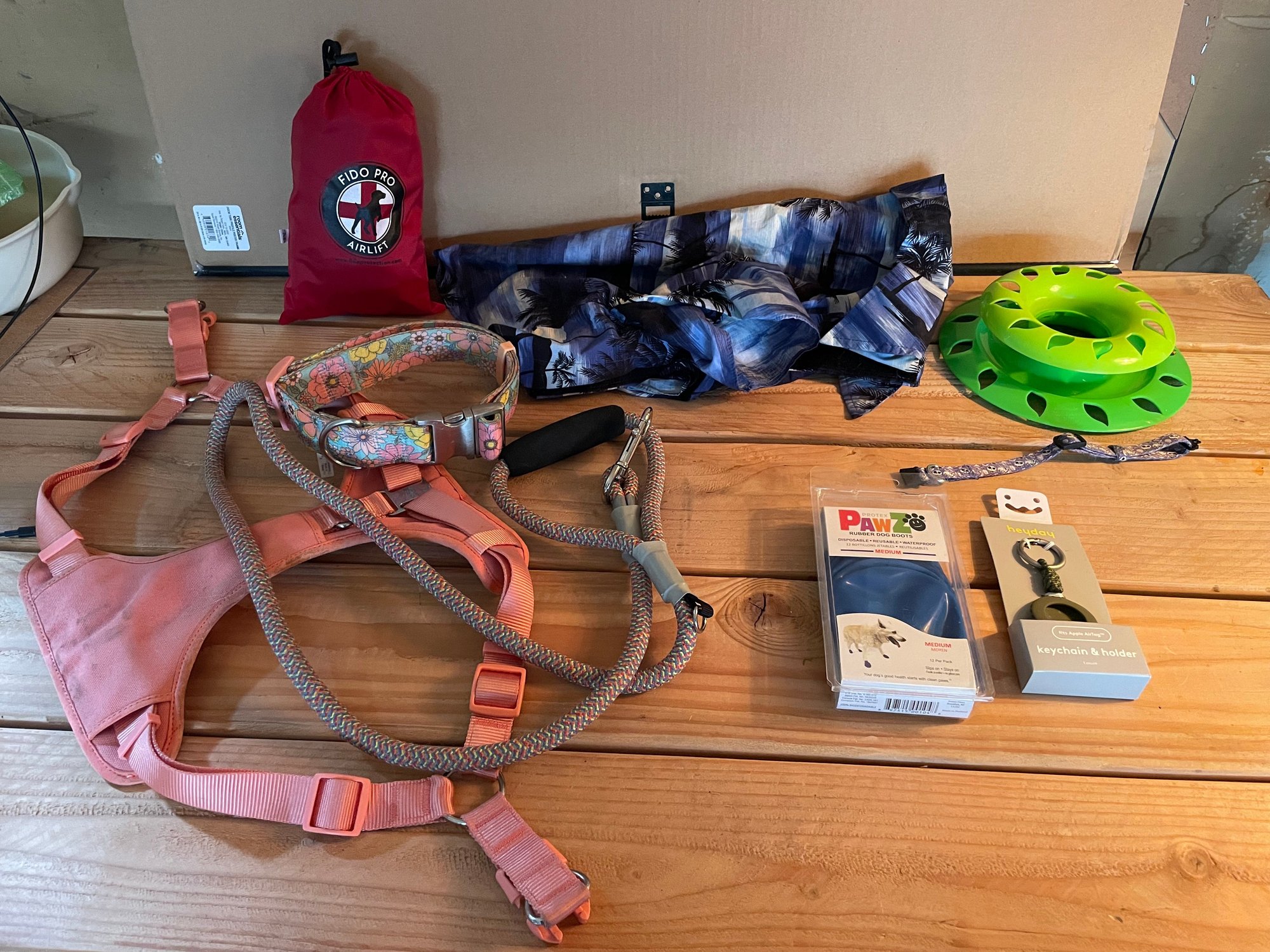 Several items for your furry friends. A Fido Pro air lift (a sling that a dogs legs go through with straps so a person can carry their dog like a back pack, incase of injury wile hiking or other adventuring) for medium sized dog 35 lbs or smaller. XL doggie Hawaiian shirt, a L pink and floral collar with a similarly colored lease and a M sized peach dog harness. Along with medium size rubber doggie socks and an air tag holder, as well as a cat toy and a Nightmare Before Christmas cat collar. The harness has some staining. These items can be shipped.