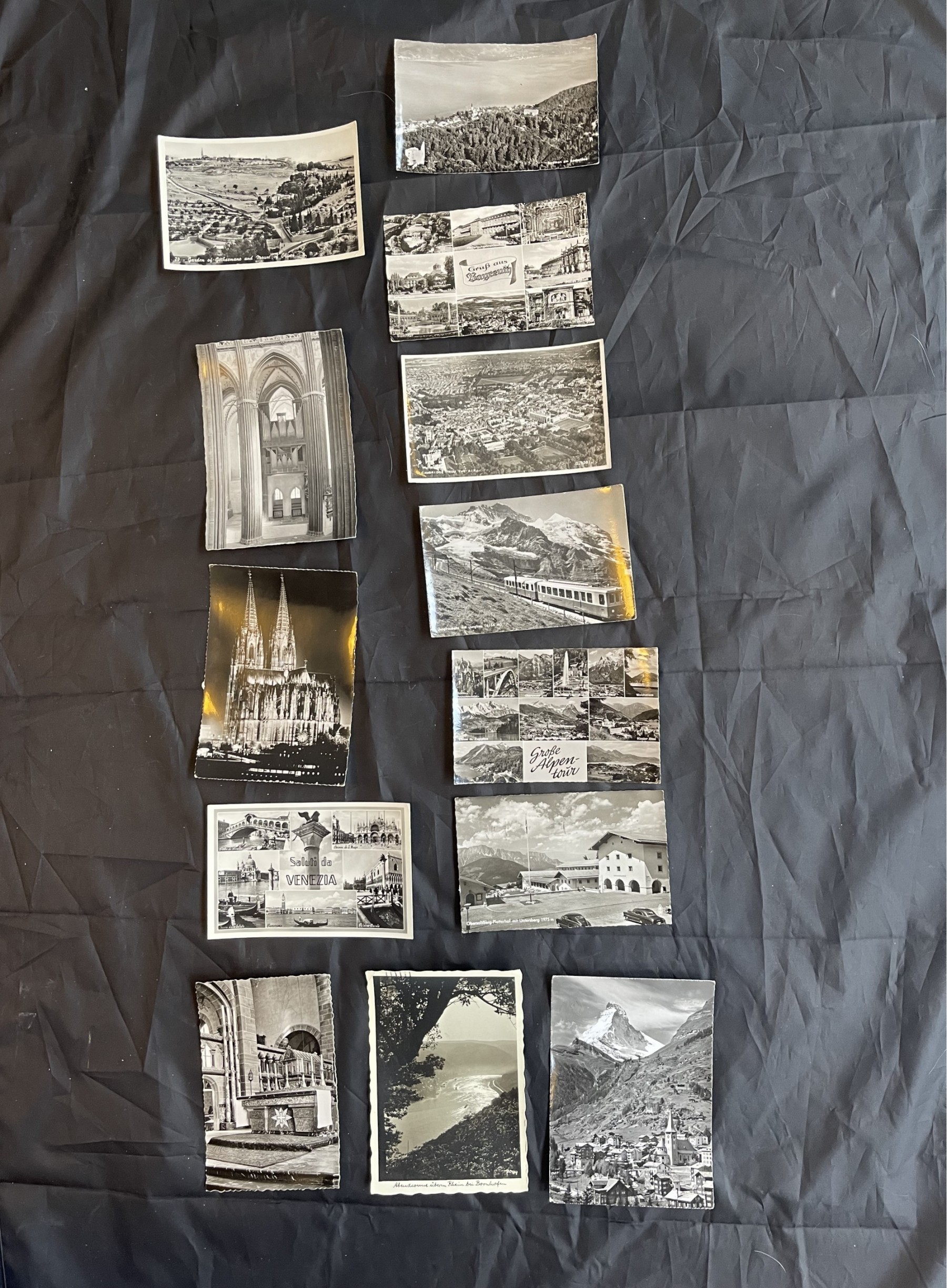 Vintage Post Cards postmarked C.1956-1962. Germany, England, Switzerland, Italy, Jordan. All have been written on and mailed. some are missing their stamps.