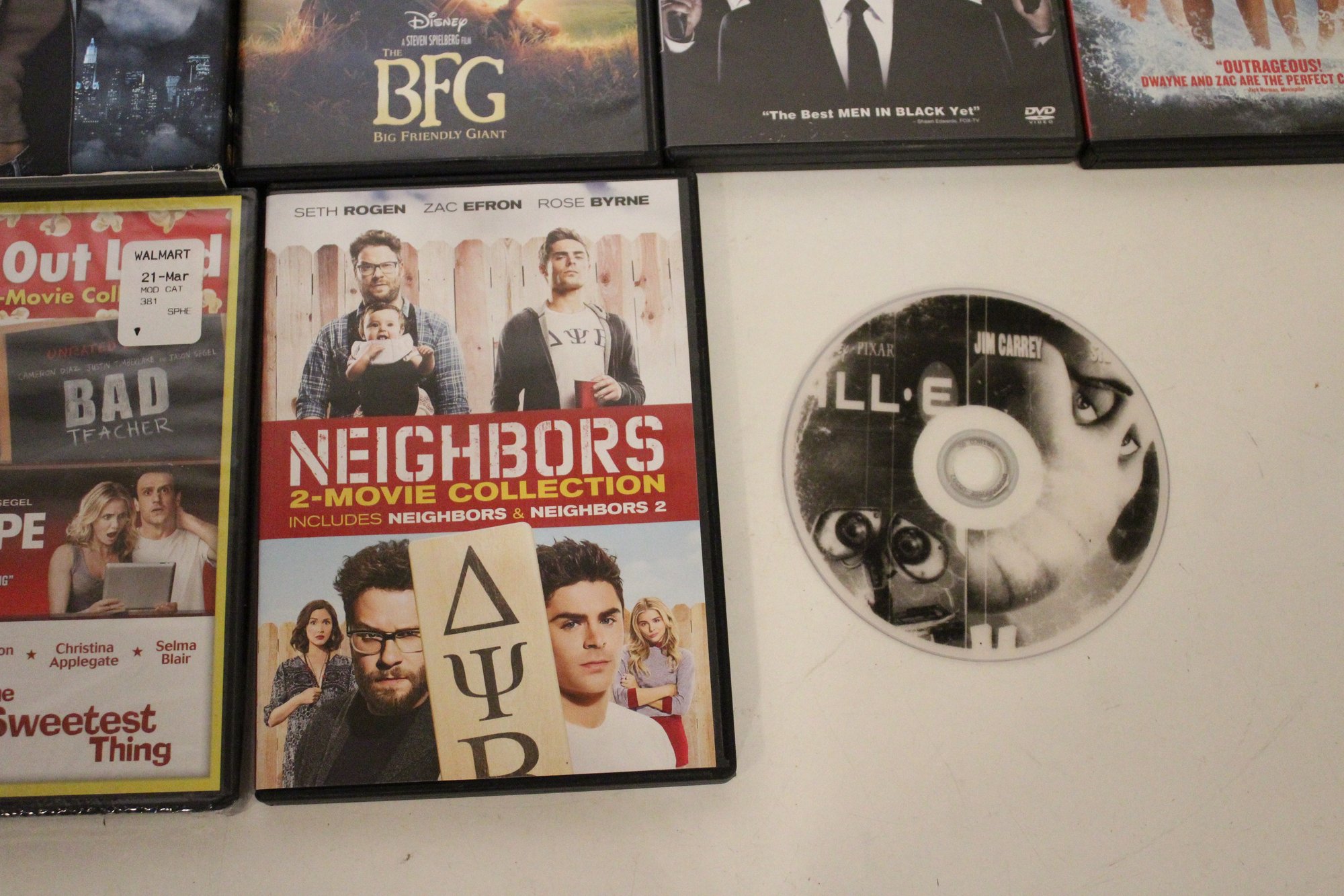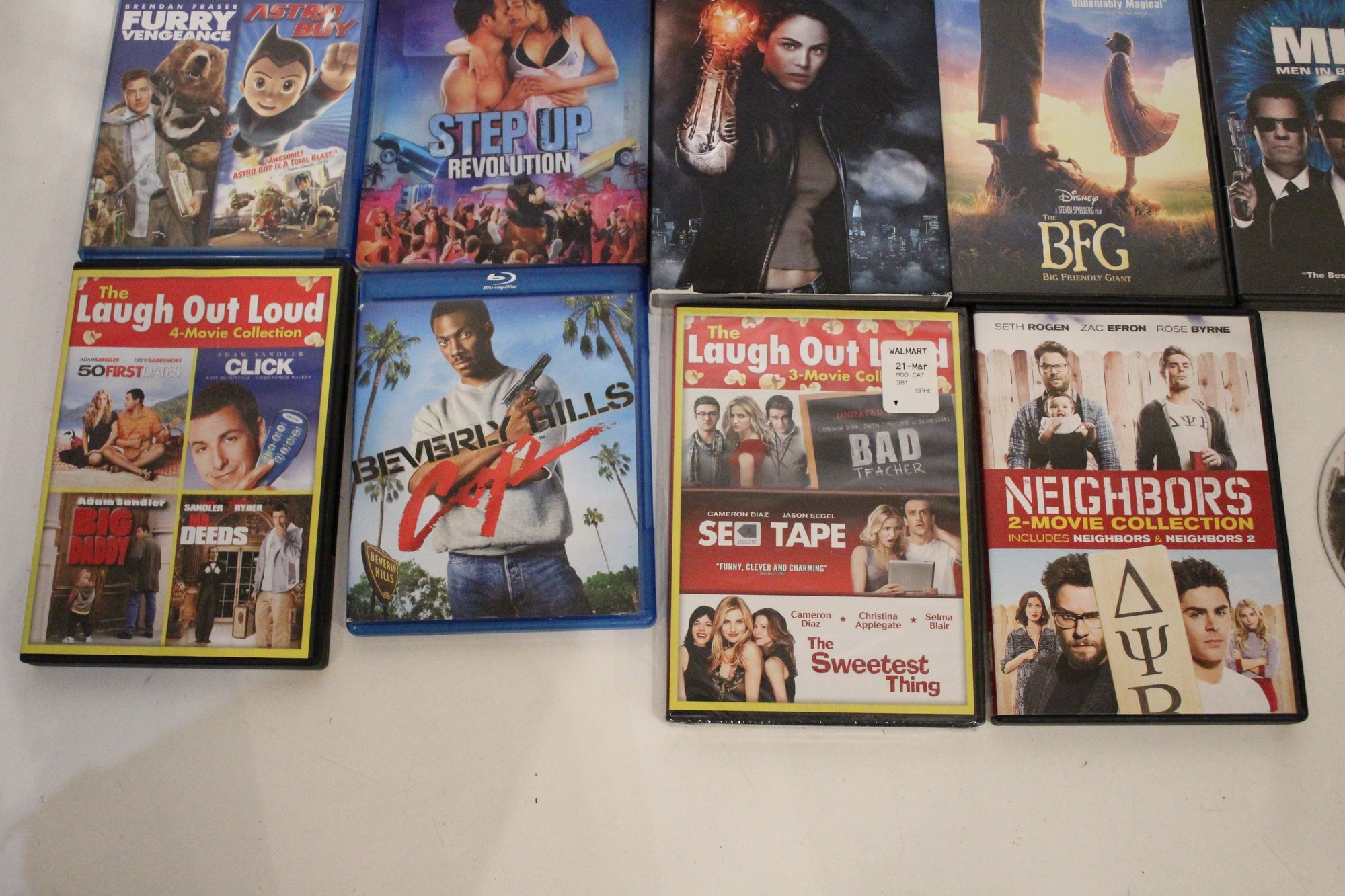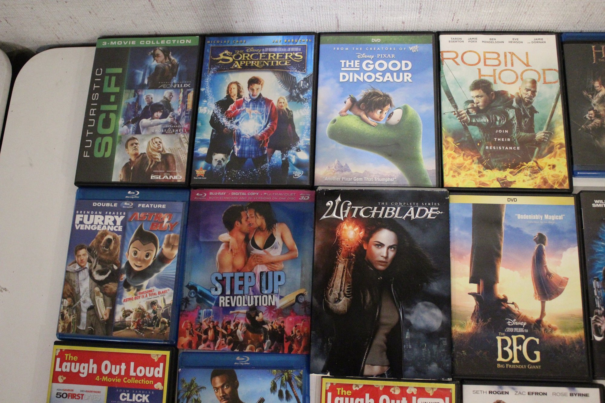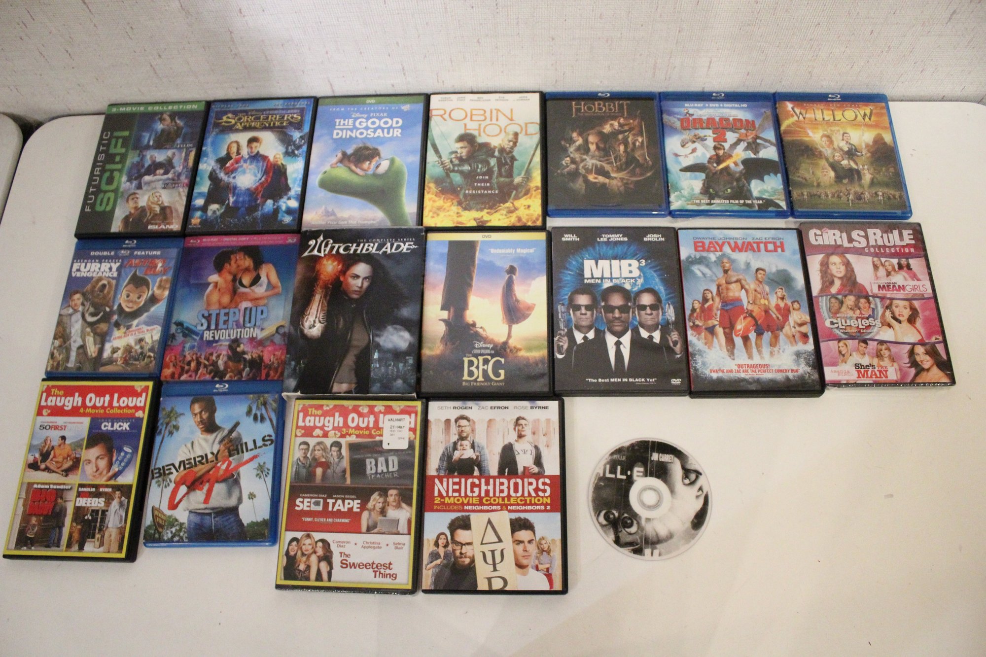 A mixed DVD and Blu-ray movie lot featuring family favorites, fantasy adventures, comedies, and action films, including titles like The Hobbit, Men in Black 3, The Good Dinosaur, Step Up Revolution, How to Train Your Dragon 3, and Baywatch. Great variety for all ages with popular franchises, animated films, and feel-good comedies. Some multi packs are missing discs. These items can be shipped.