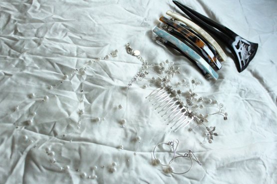 A set of faux pearl matching necklace, 16.5" long, earrings and hair piece. As well as 3 barrels and a hair pin. These items can be shipped.